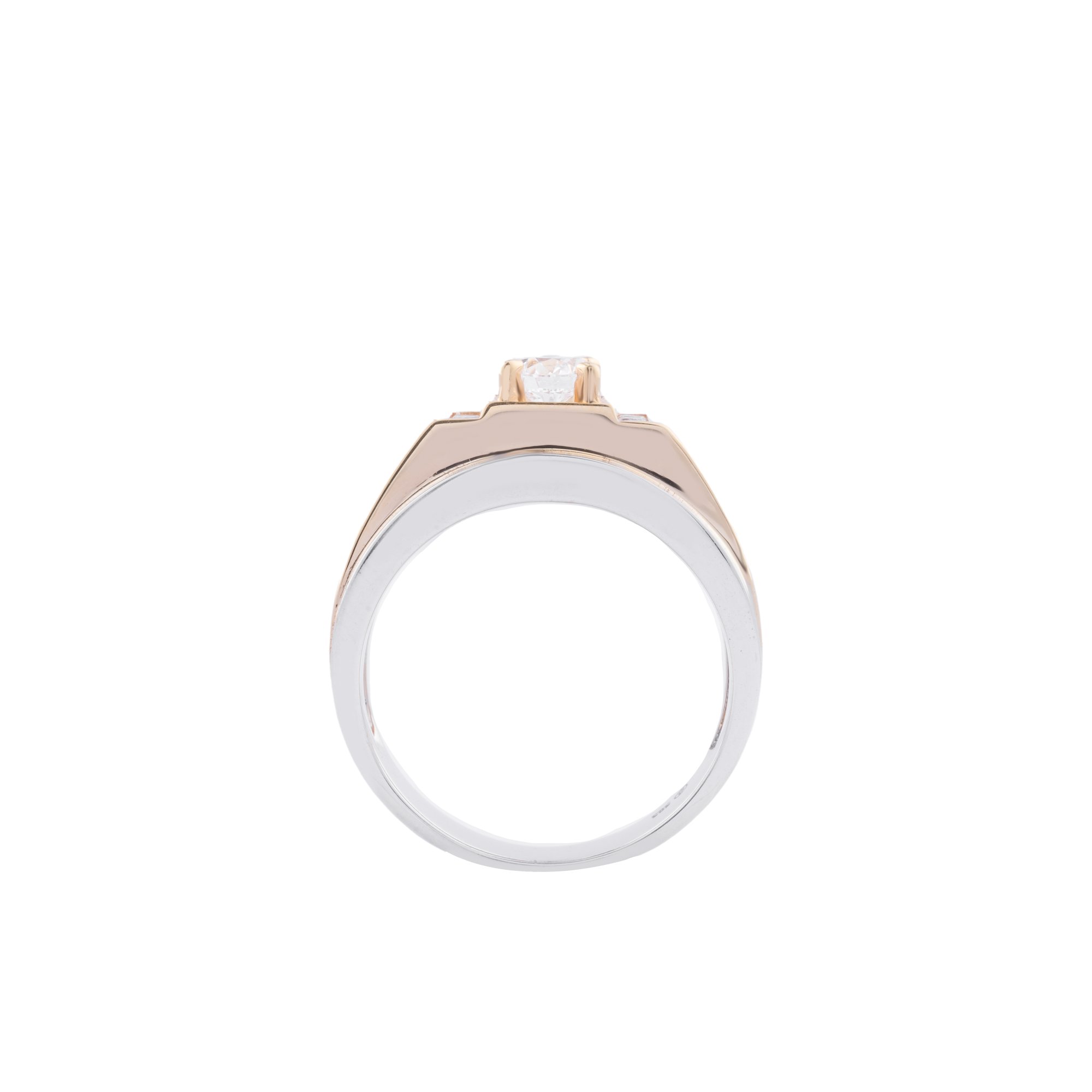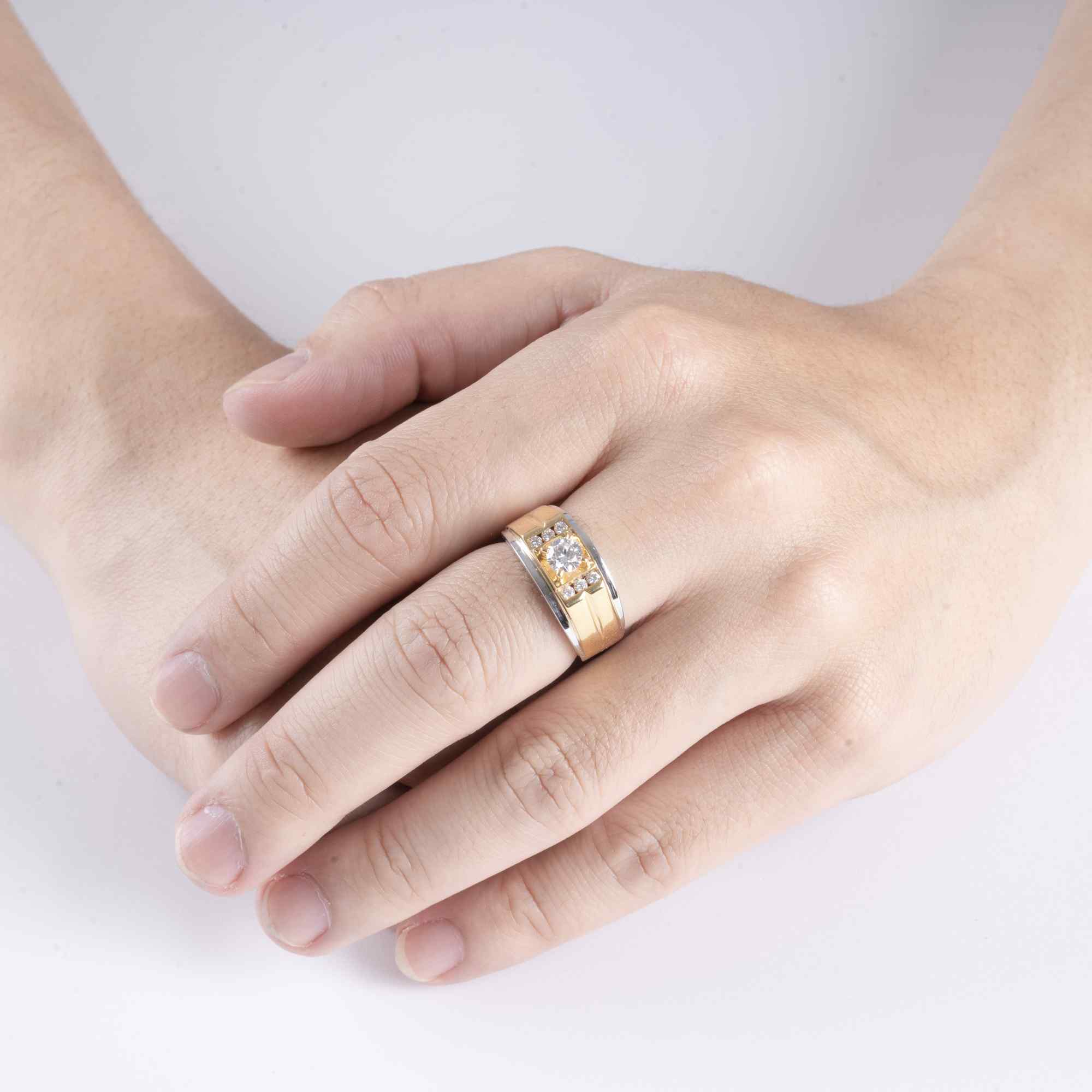 Chiếc nhẫn mang thiết kế bản rộng với những đường nét dứt khoát, thể hiện vẻ đẹp mạnh mẽ và nam tính. Tâm nhẫn được tôn vinh bởi viên kim cương chủ nổi bật, được nâng đỡ chắc chắn bởi phần chấu tinh xảo. Hai bên thân nhẫn được điểm xuyết thêm những viên kim cương tấm, tạo nên hiệu ứng ánh sáng rực rỡ nhưng vẫn giữ được sự cân đối và sang trọng.
