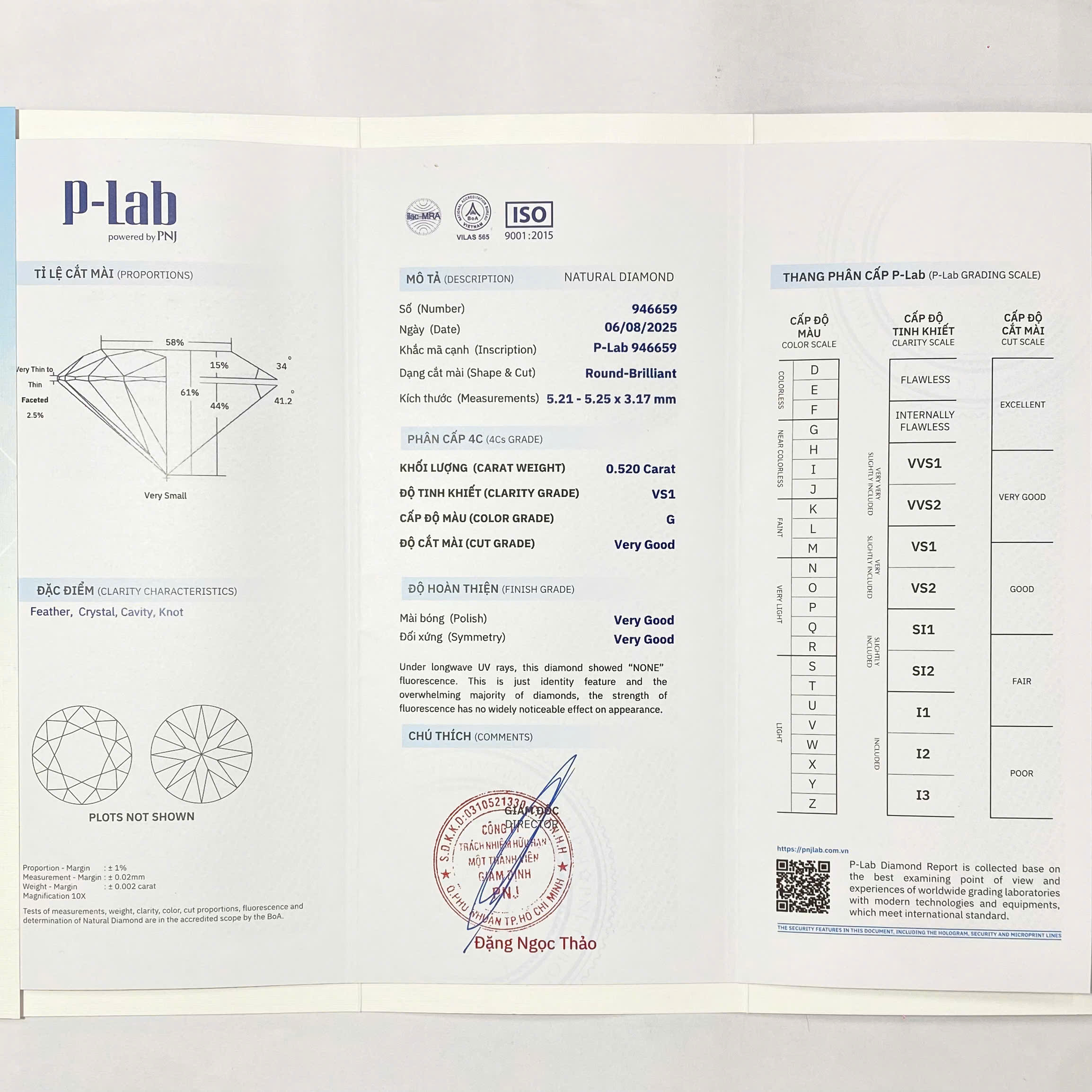 | Kim cương viên: | 4.50 - 4.52LY G/SI1, 5.21 - 5.25LY G/VS1 |