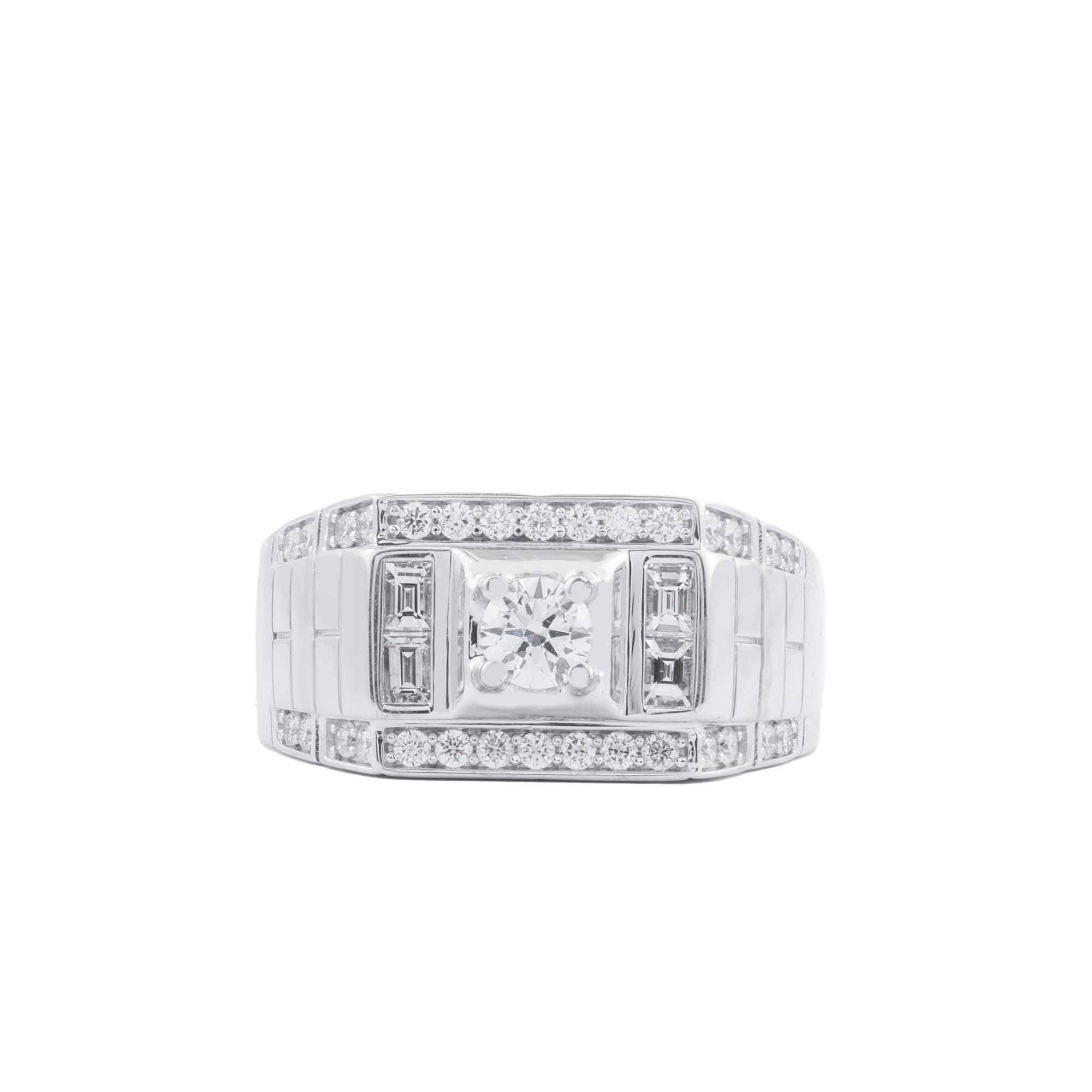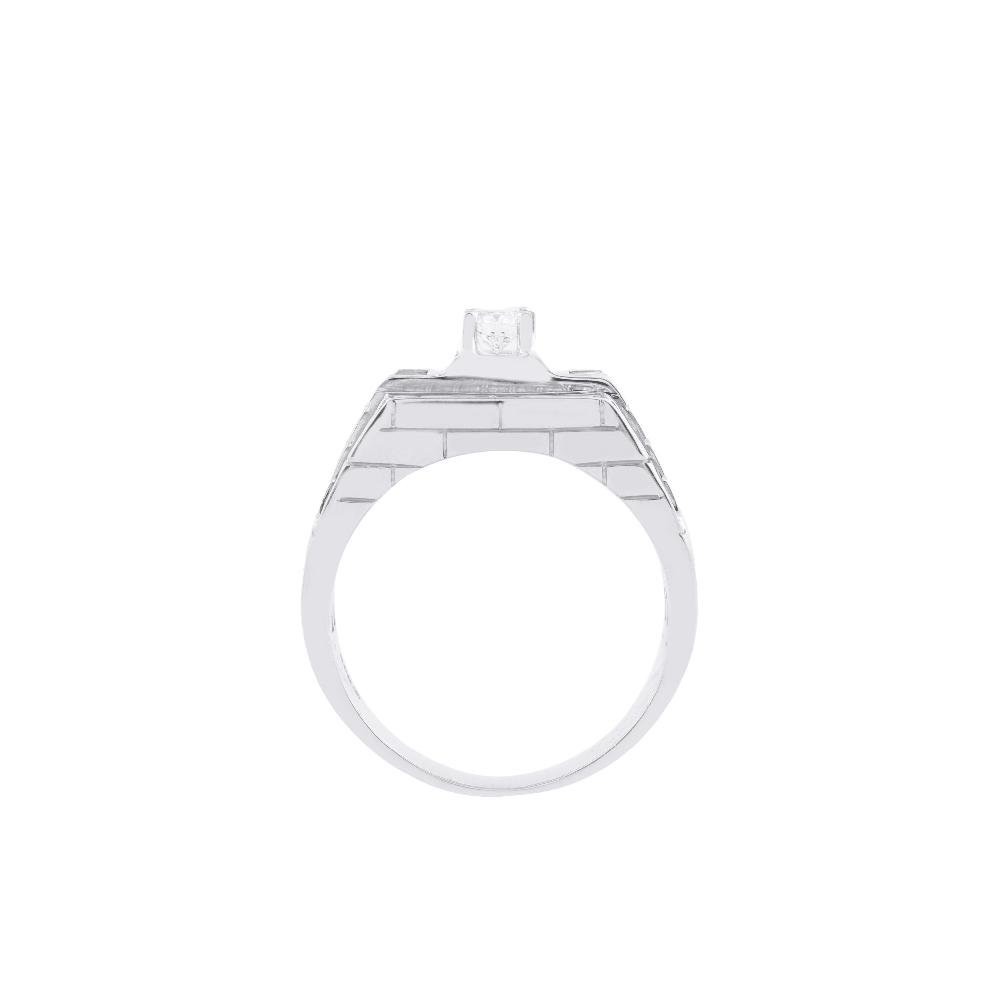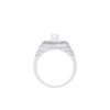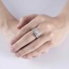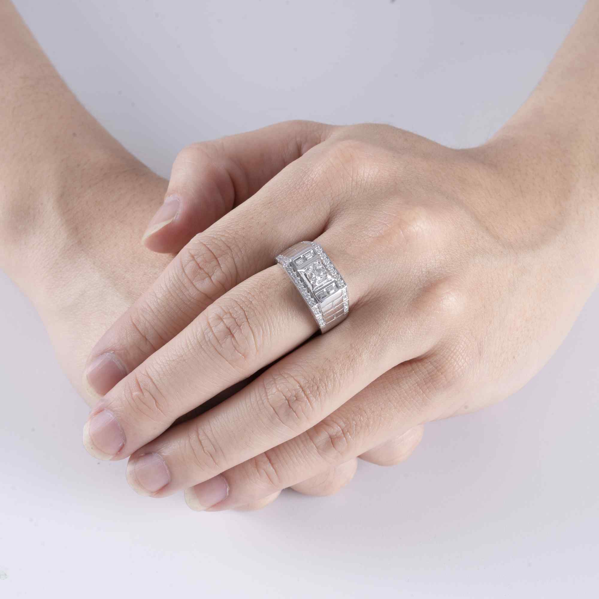 Thiết kế ấn tượng với mặt nhẫn hình chữ nhật sắc nét, cấu trúc tầng lớp mạnh mẽ như một biểu tượng của quyền lực và sự kiểm soát. Kim cương trung tâm được đặt trong khung vuông vức, bao quanh bởi viền kim cương tấm tinh xảo, tạo hiệu ứng ánh sáng dày và sắc lạnh.
