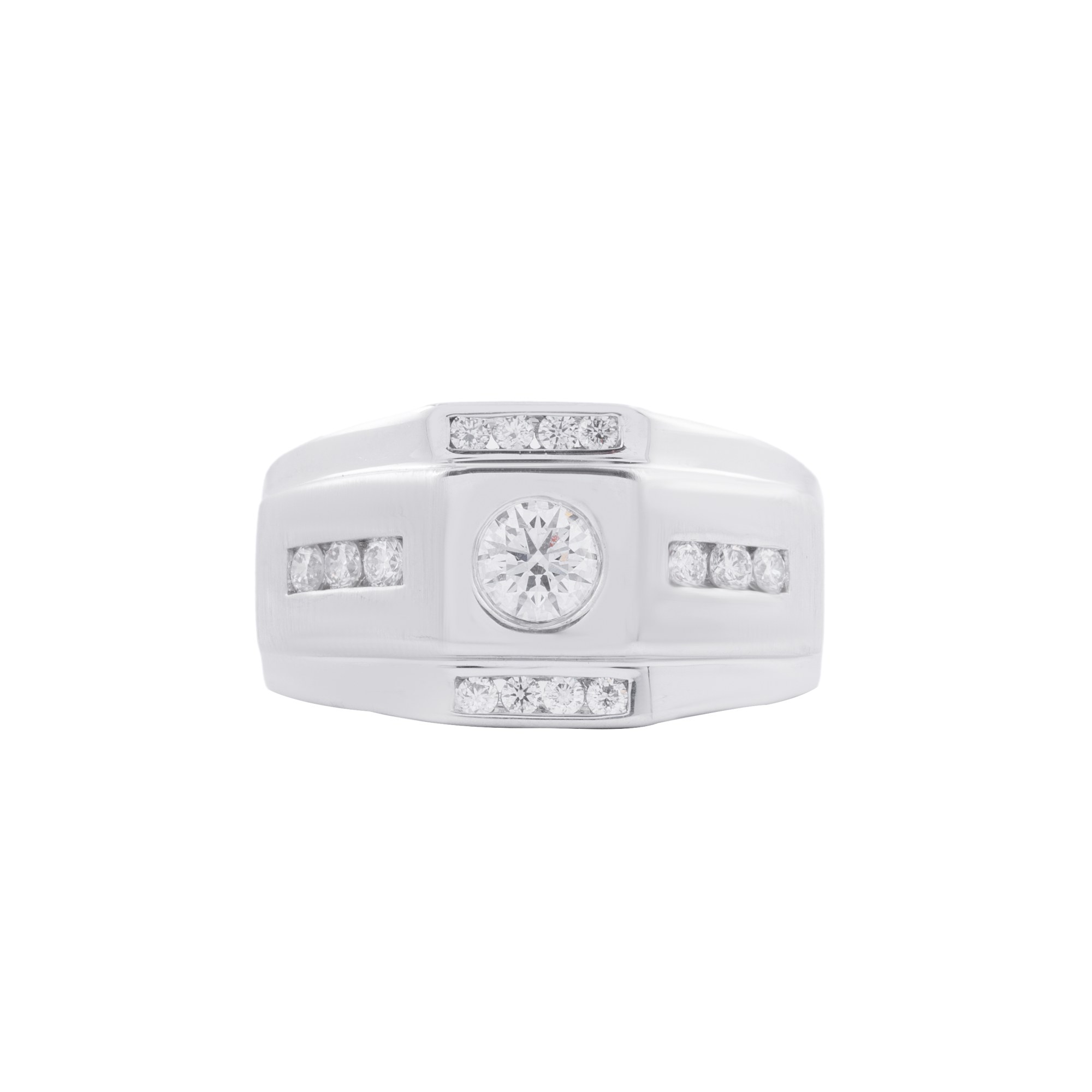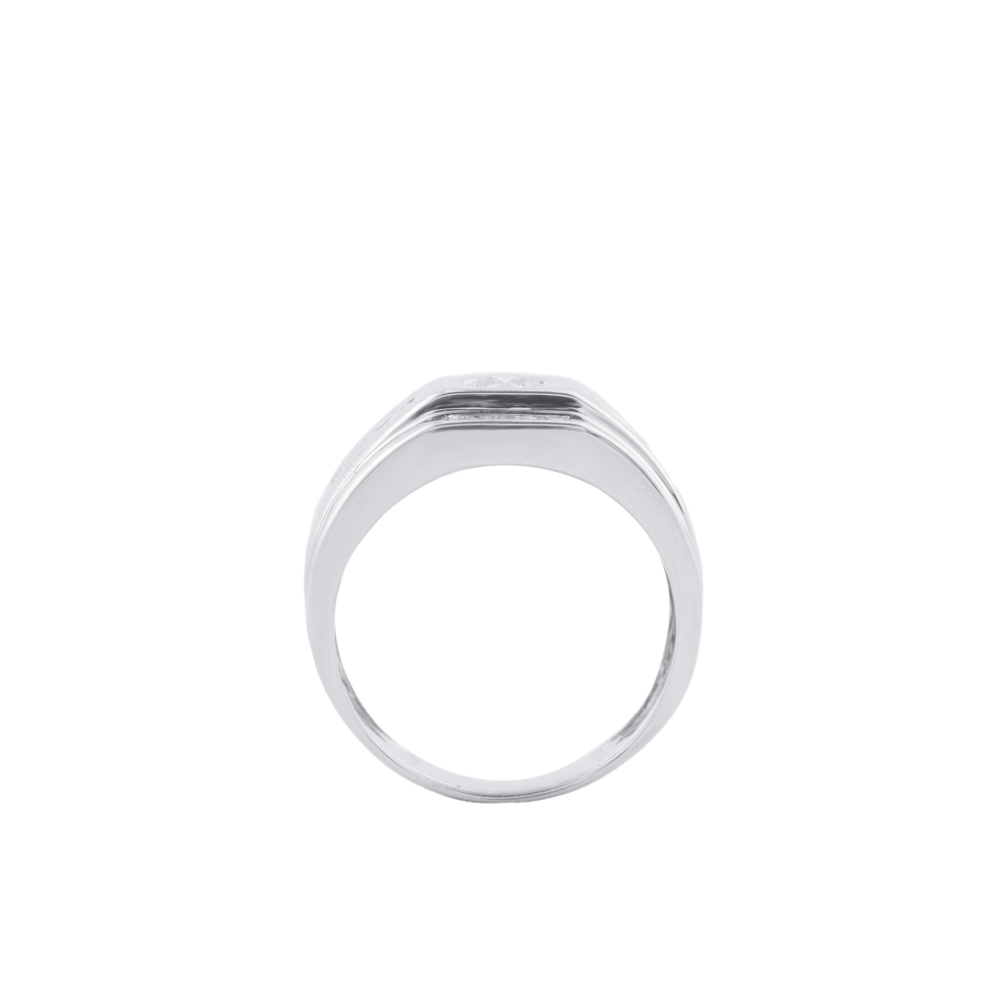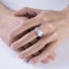 Chiếc nhẫn mang thiết kế bản lớn hiện đại, nổi bật với cấu trúc hai tầng tinh xảo tạo cảm giác vững chắc và đầy cá tính. Ở trung tâm là viên kim cương được đặt trong khung tròn gọn gàng, trở thành điểm nhấn thu hút ánh nhìn ngay từ cái chạm đầu tiên.