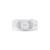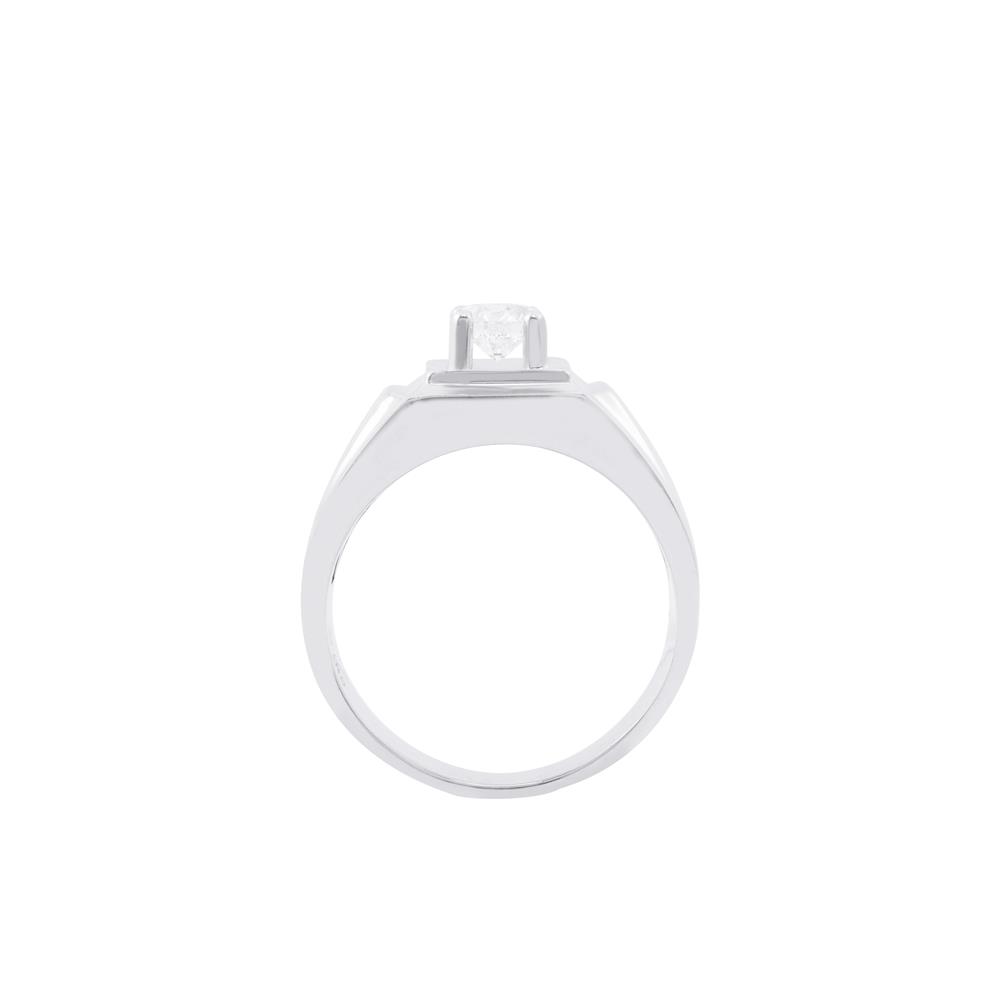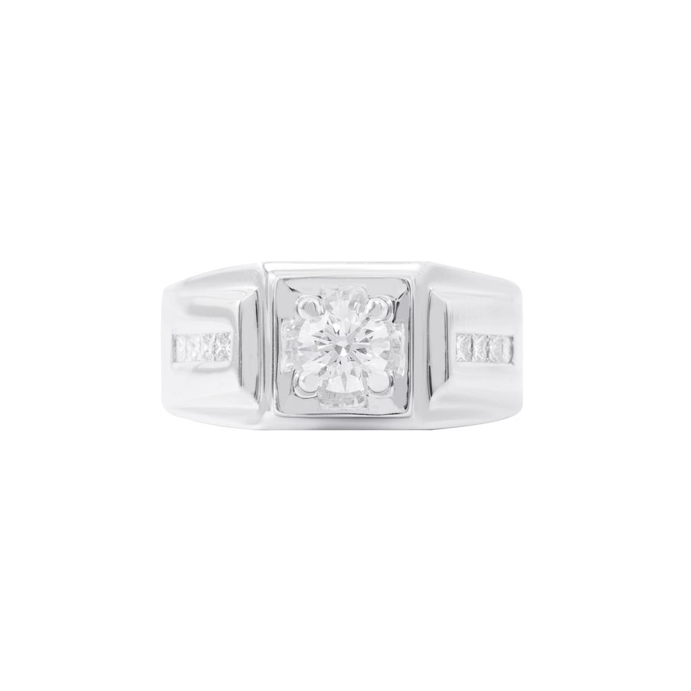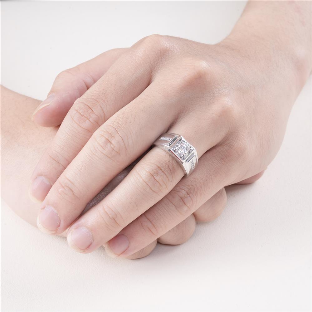 Trung tâm là viên kim cương chủ sáng rực, được đặt trong khung vuông sắc nét – biểu tượng của sự vững vàng, ổn định và bản lĩnh dẫn đầu. Hai bên thân nhẫn được điểm xuyết bằng các viên kim cương tấm, cân đối hoàn hảo, tăng độ lấp lánh nhưng vẫn giữ tinh thần tinh tế và nam tính.
