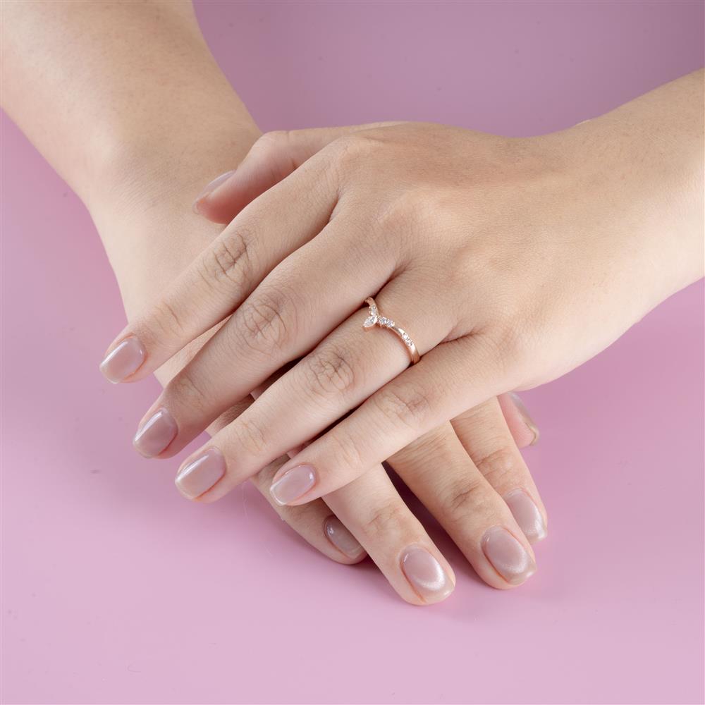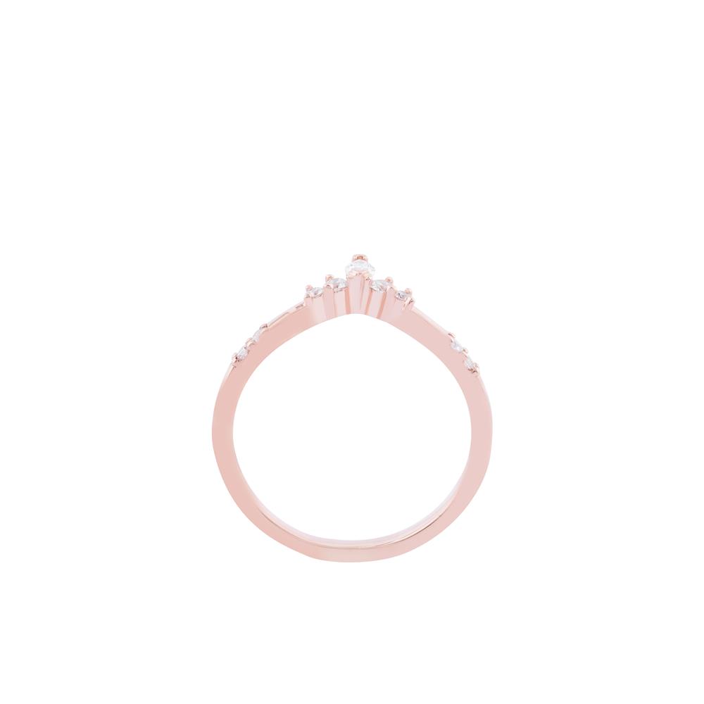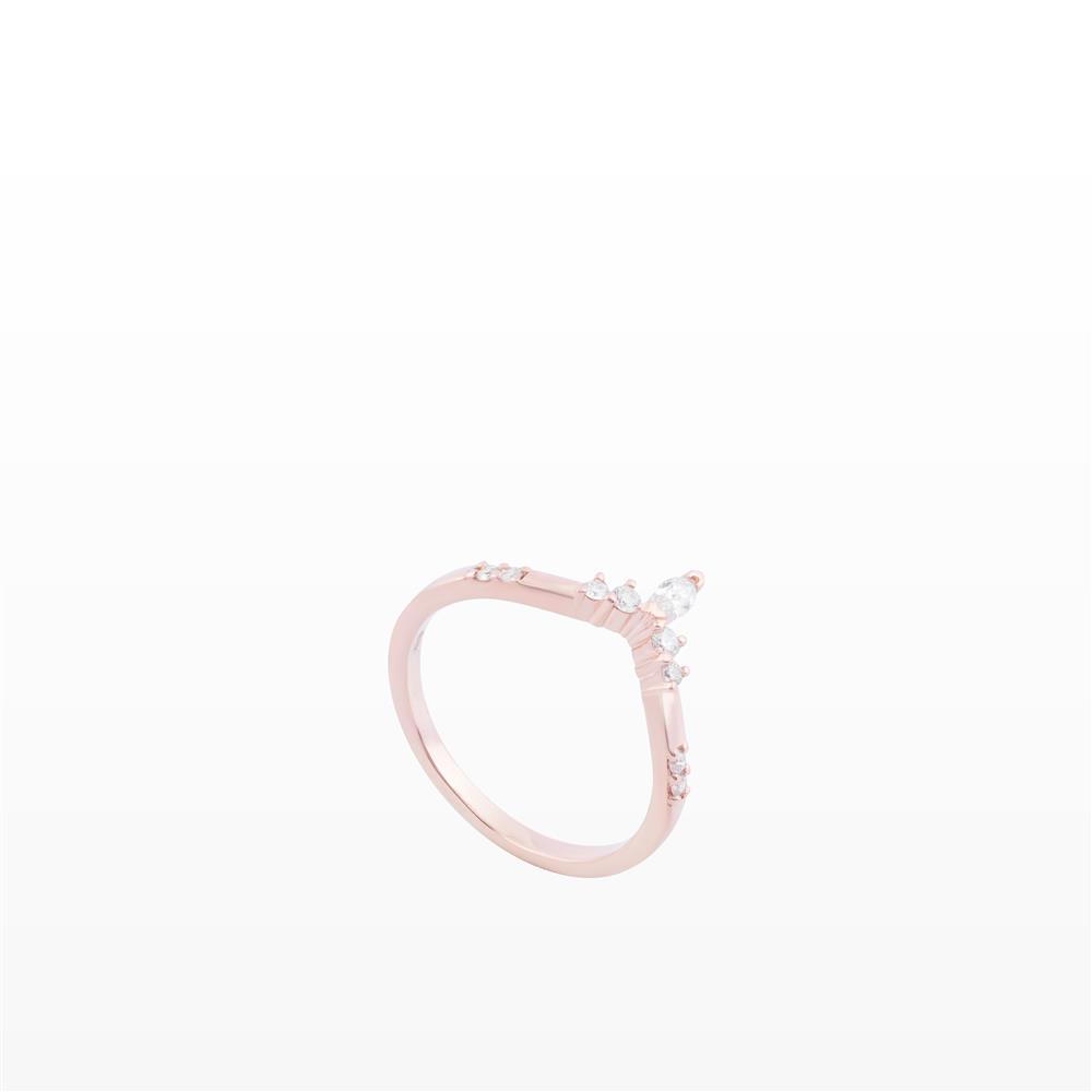 Thiết kế dáng chữ V tinh tế tôn trọn đường cong ngón tay, với viên kim cương cắt Marquise ở đỉnh như ánh sáng dẫn lối, lan tỏa qua từng viên kim cương tấm hai bên.