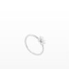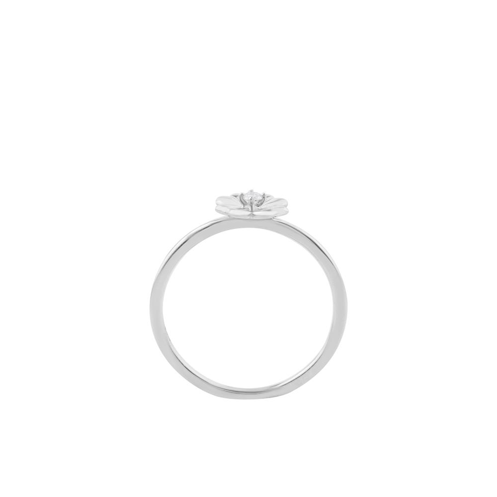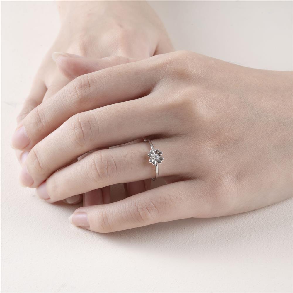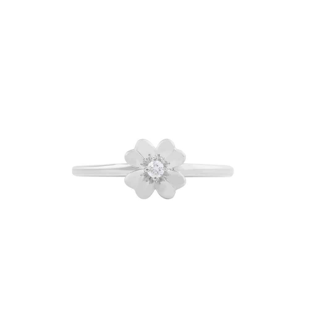 Thiết kế nhẫn lấy cảm hứng từ bông hoa trắng đang khẽ nở, với những cánh hoa bo tròn mềm mại, mang vẻ đẹp trong trẻo và tinh khôi. Ở trung tâm, viên kim cương nhỏ tỏa sáng nhẹ nhàng như giọt sương sớm, tạo điểm nhấn tinh tế mà không phô trương.