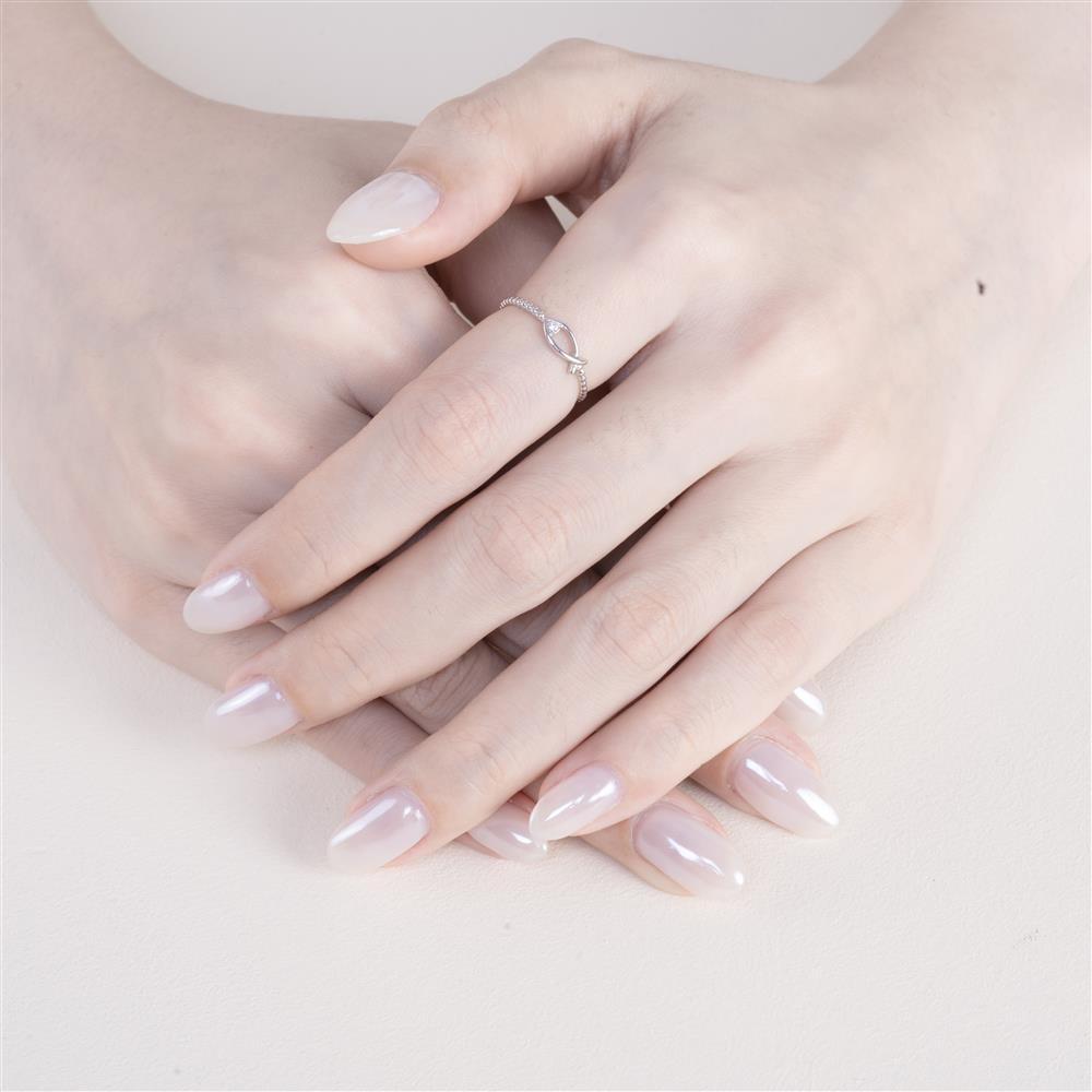 Thiết kế đặc biệt như hình con cá cách điệu, phần thân nhẫn là chuỗi hạt tròn nhỏ tinh xảo, mang lại sự mềm mại và hiện đại. Điểm nhấn chính là chi tiết “con cá” ôm lấy viên kim cương lấp lánh, biểu trưng cho sự may mắn, bình an và tài lộc.