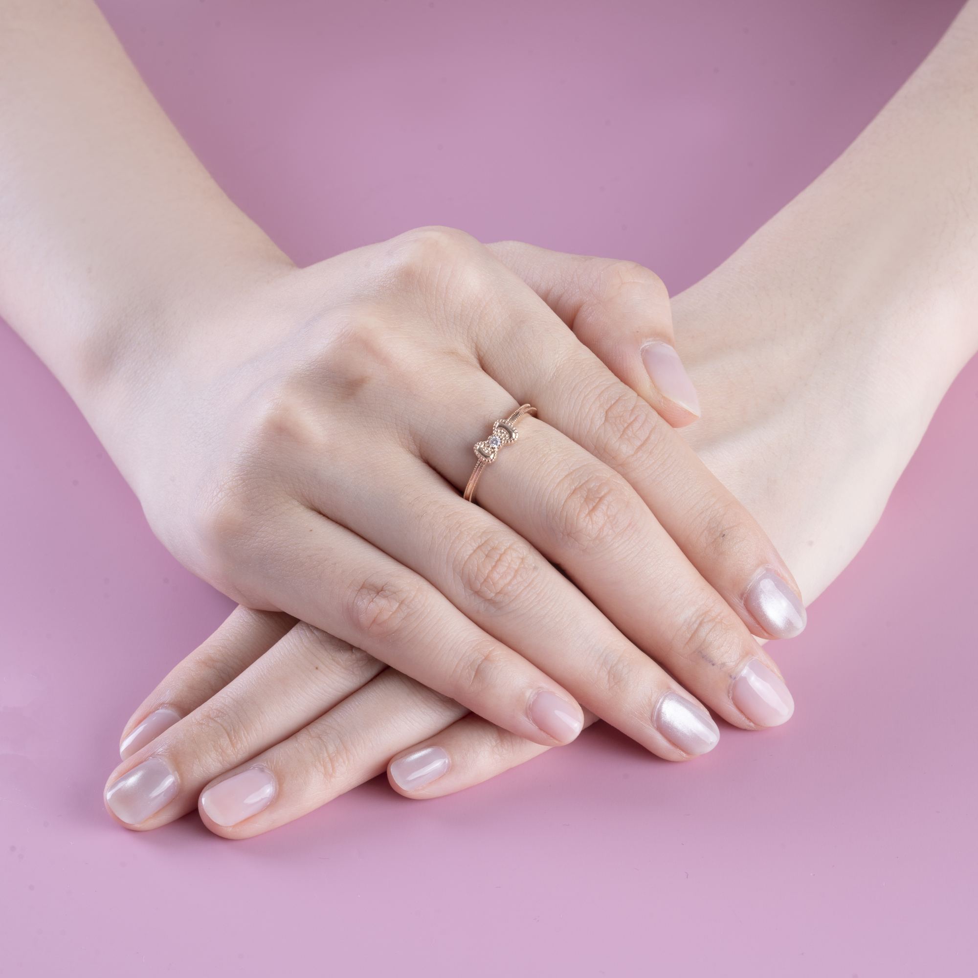 Nhẫn kim cương họa tiết nơ tinh xảo mang vẻ đẹp dịu dàng và đầy nữ tính. Thiết kế hình nơ mềm mại được chế tác tỉ mỉ, kết hợp viền hạt nhỏ tạo điểm nhấn cổ điển thanh lịch. Tổng thể thanh mảnh, nhẹ nhàng nhưng vẫn đủ nổi bật, như một chi tiết duyên dáng tôn lên phong cách tinh tế của người đeo.