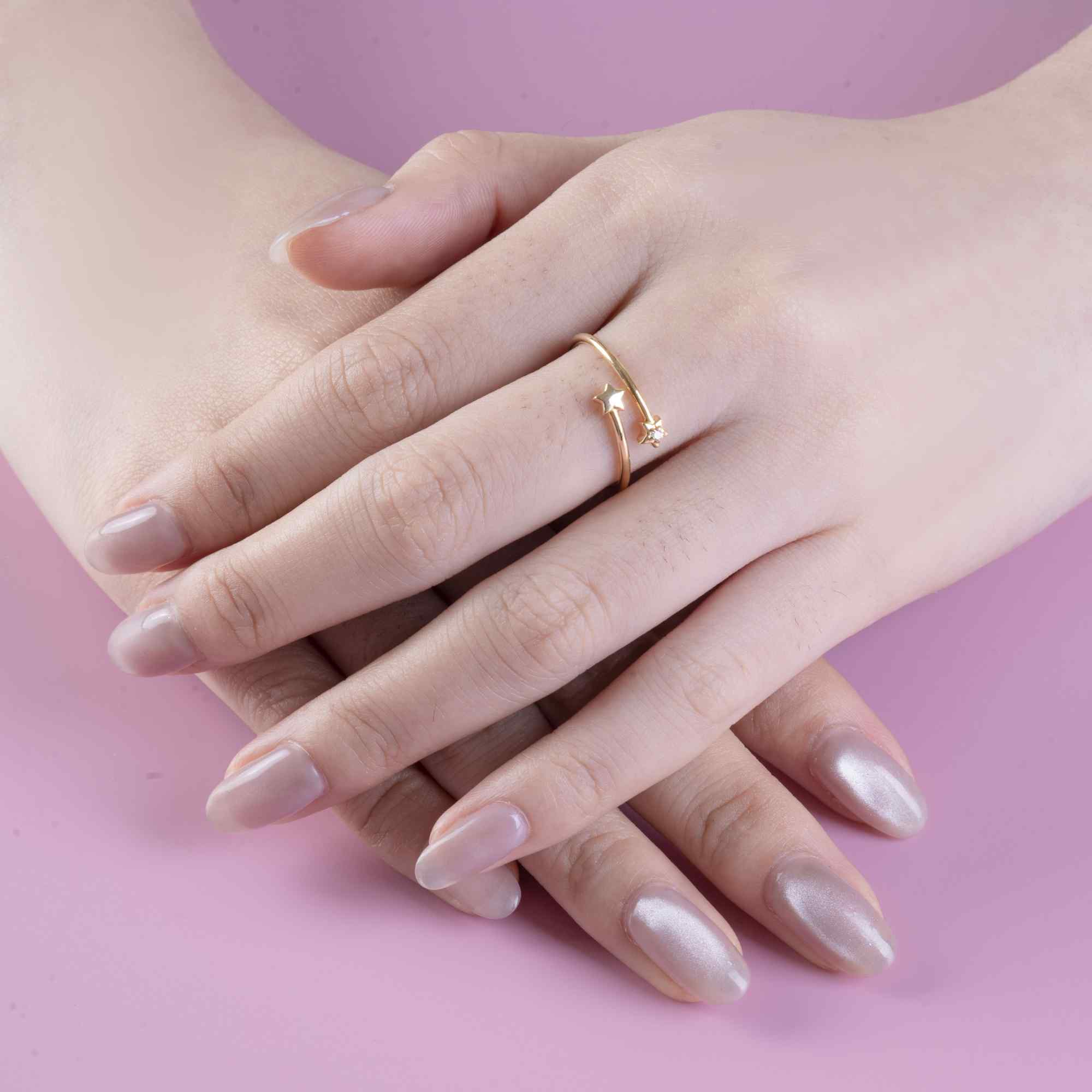 Tựa như một vì sao vàng khẽ tỏa sáng trên đầu ngón tay, chiếc nhẫn vàng đính kim cương họa tiết ngôi sao mang vẻ đẹp tinh tế, ấm áp và đầy cảm xúc. Ngôi sao nhỏ bằng vàng được tạo hình mềm mại, biểu trưng cho hy vọng, cho những ước mơ thầm lặng và cho ánh sáng luôn dẫn lối trong hành trình yêu thương.