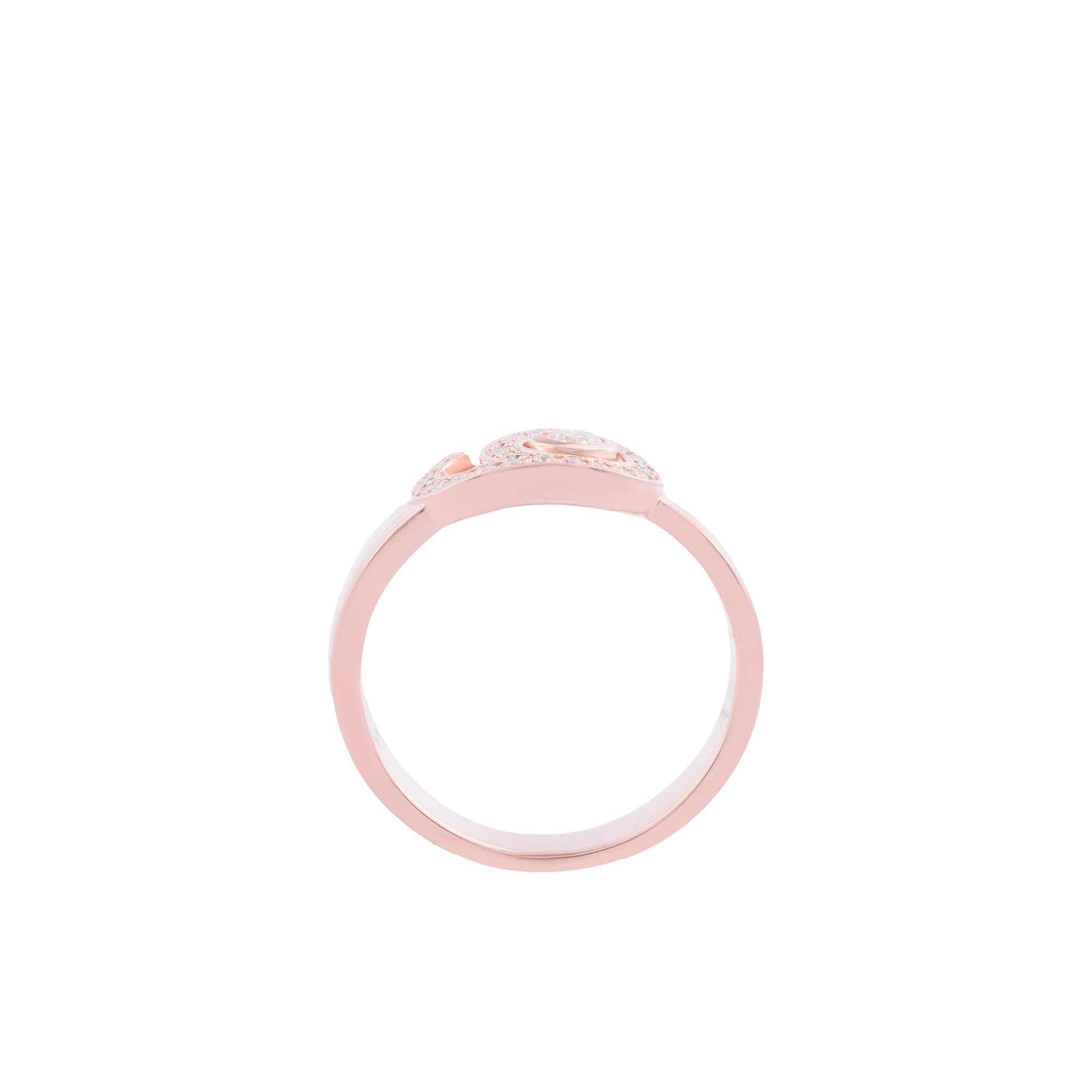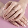 Chiếc nhẫn kim cương mang thiết kế mềm mại với đường cong uyển chuyển ôm lấy tâm nhẫn, tạo nên cảm giác như một vòng tay dịu dàng đang nâng niu điều quý giá nhất. Viên kim cương trung tâm được bao quanh bởi vòng kim cương tấm lấp lánh, tựa như ánh sáng lan tỏa từ một trái tim đang yêu — ấm áp, bền bỉ và đầy hy vọng.