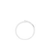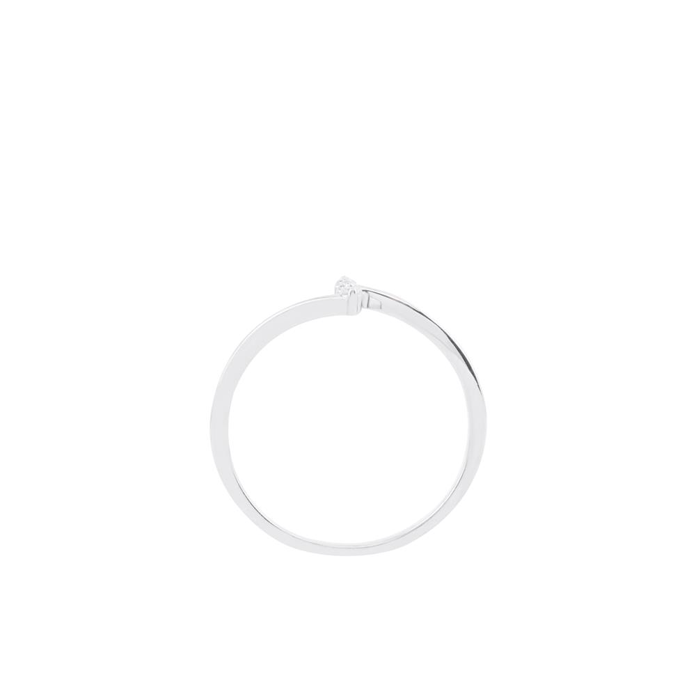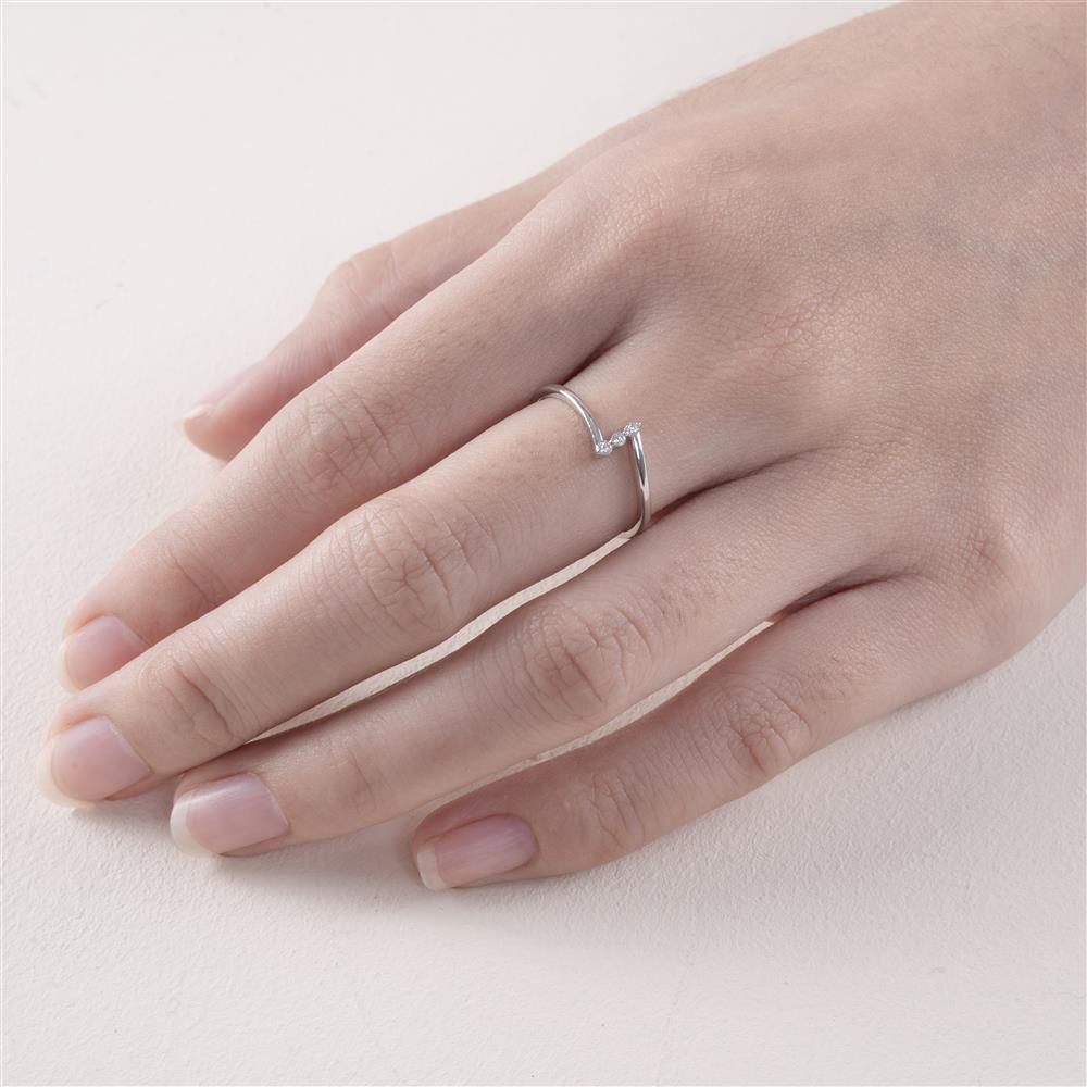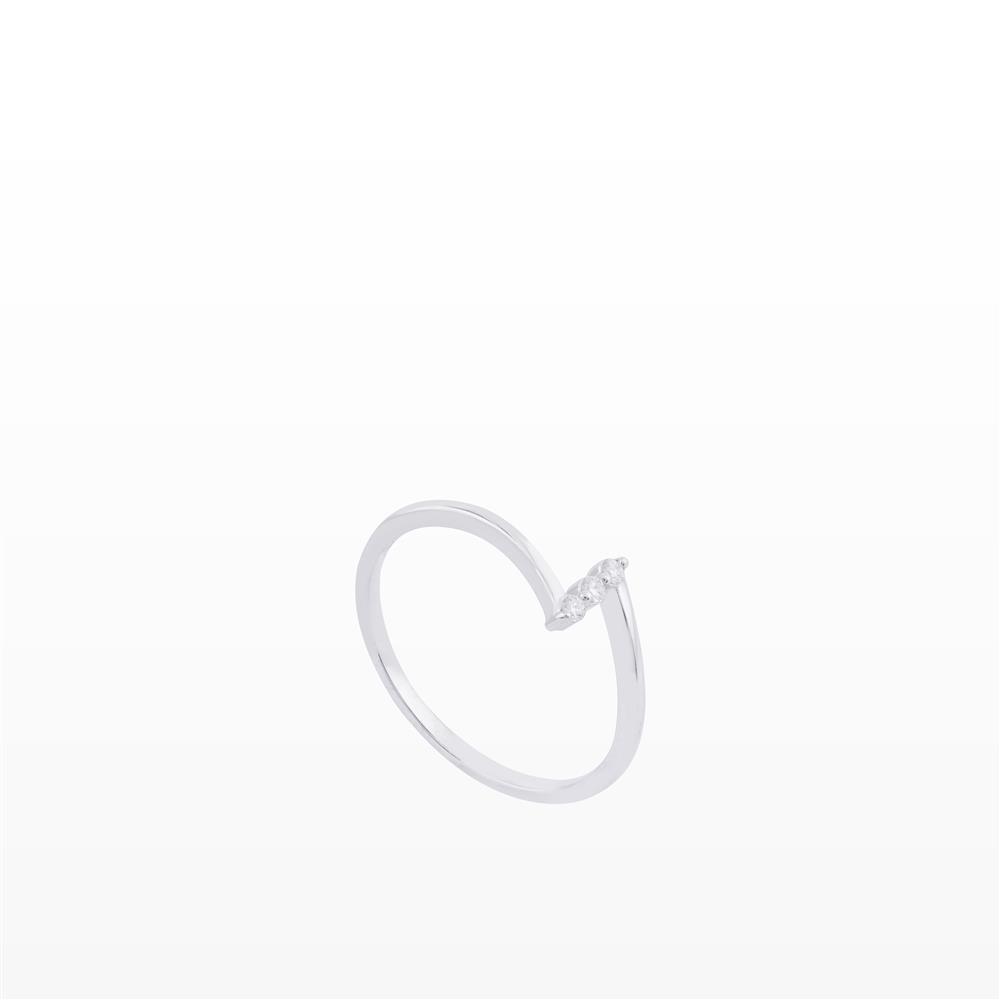Mẫu nhẫn sở hữu thiết kế đặc trưng với hai dải thân nhẫn giao nhau đầy mềm mại, tạo hiệu ứng thị giác thanh thoát và uyển chuyển trên đôi tay. Tại điểm giao thoa, ba viên kim cương tròn sáng trong được đính nổi bật, tạo thành một đường sáng tinh tế nhưng đầy cuốn hút.