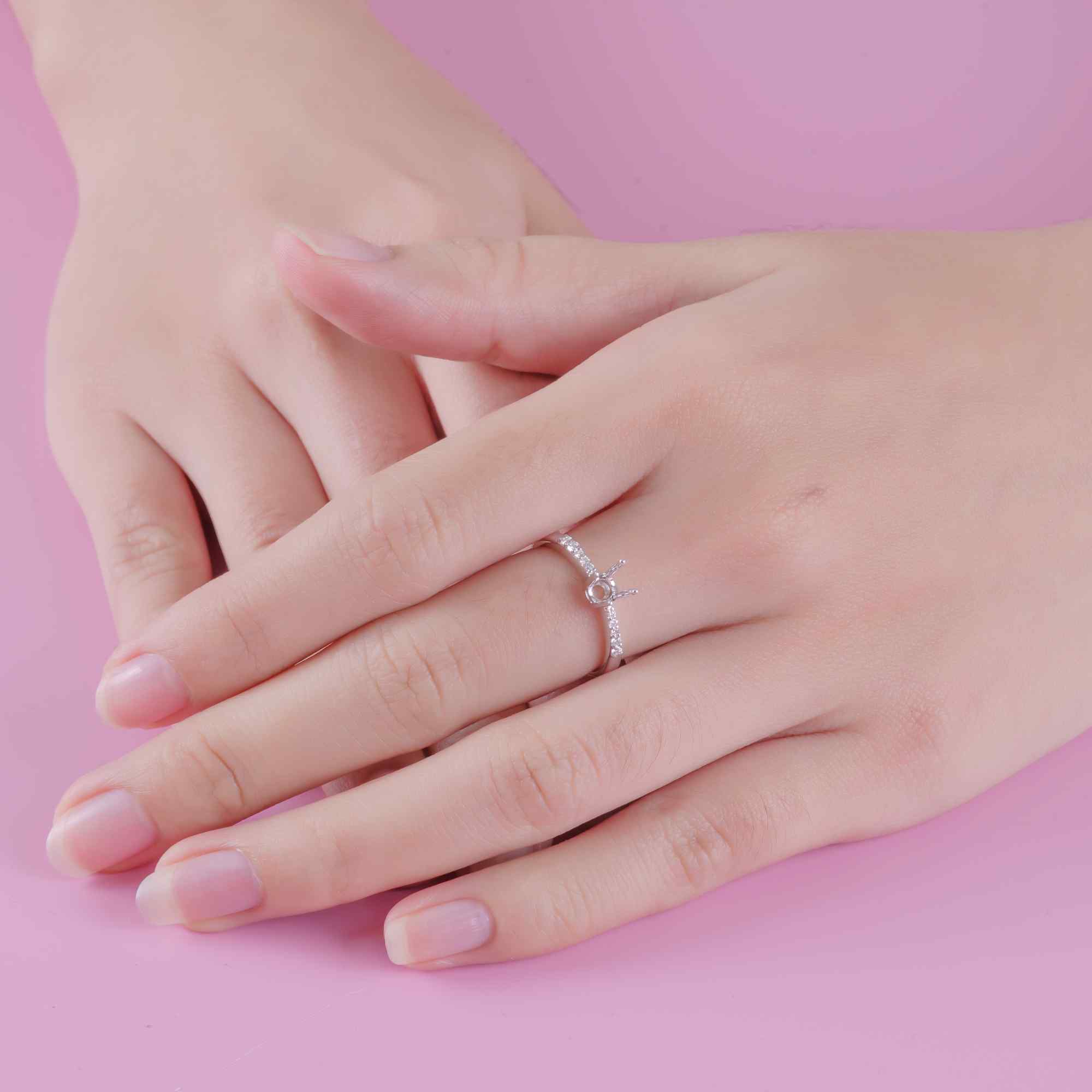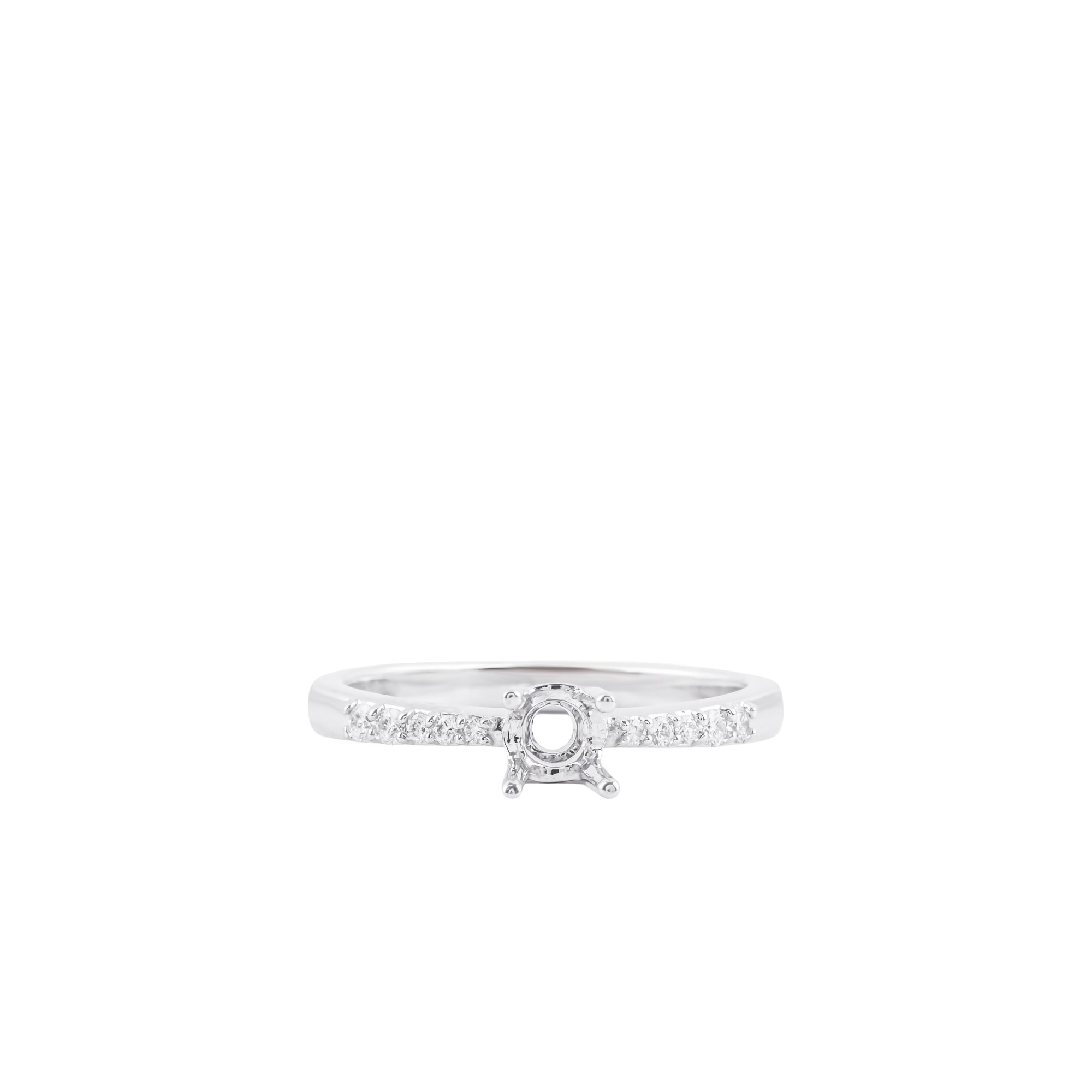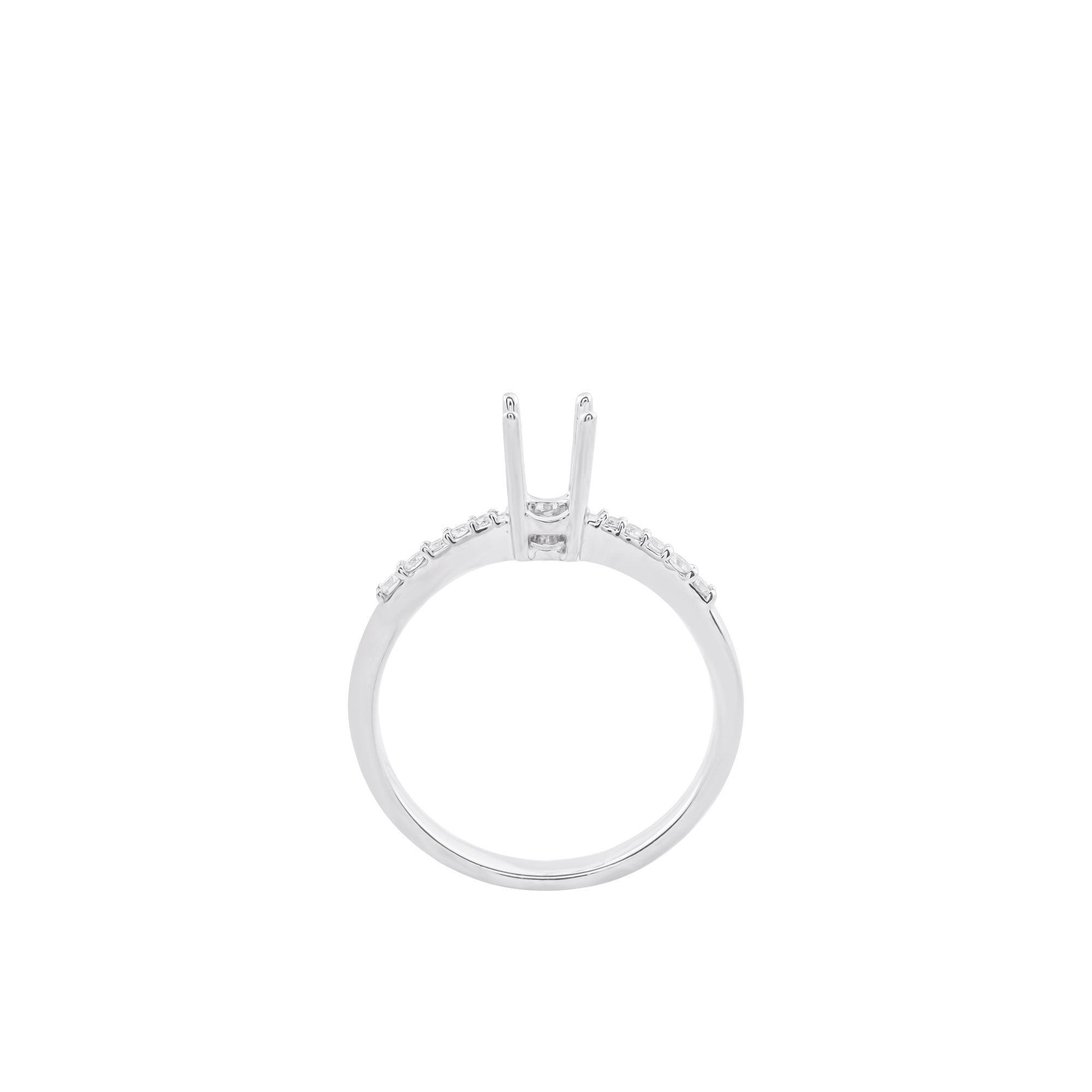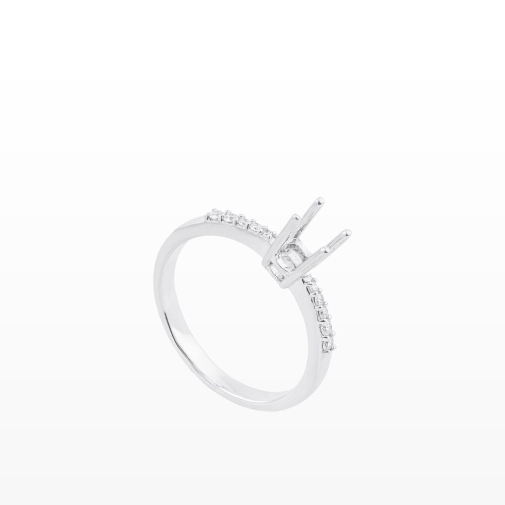 Vỏ nhẫn kim cương vàng trắng thiết kế chấu cao thanh mảnh, giúp viên chủ nổi bật và bắt sáng tối đa. Thân nhẫn đính kim cương tấm tinh tế, tạo hiệu ứng lấp lánh nhẹ nhàng nhưng sang trọng. Form nhẫn hiện đại, thanh thoát, tôn trọn vẻ đẹp của viên kim cương trung tâm.