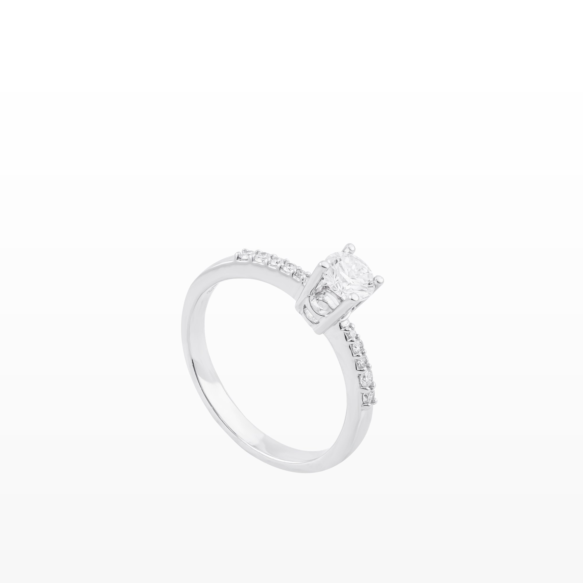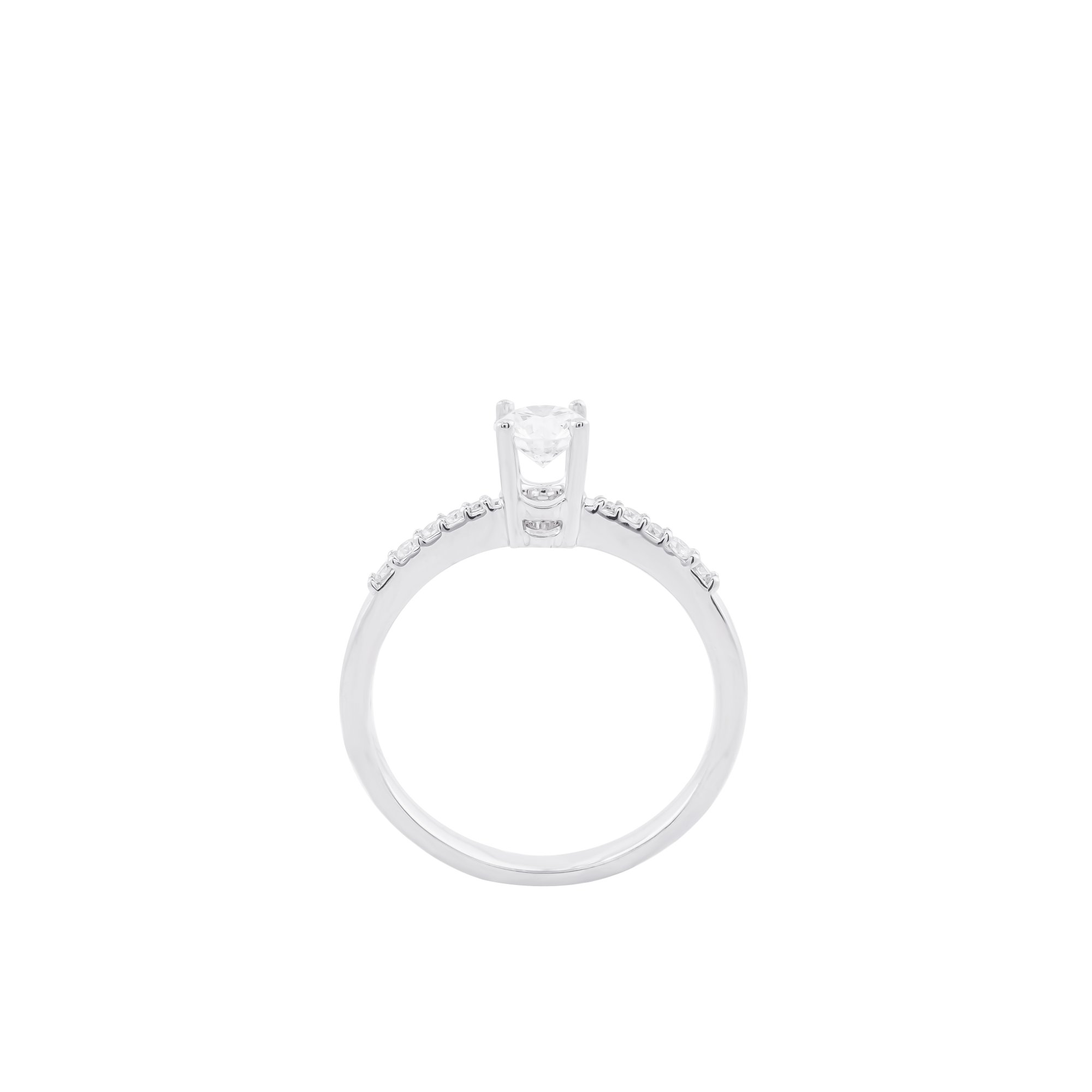 Nhẫn kim cương vàng trắng nổi bật với viên chủ được nâng cao bởi chấu thanh mảnh, tôn trọn độ rực rỡ và tinh khiết của kim cương. Hai hàng kim cương tấm trên thân nhẫn tạo hiệu ứng lấp lánh tinh tế, mang đến vẻ đẹp sang trọng, hiện đại và đầy cuốn hút.