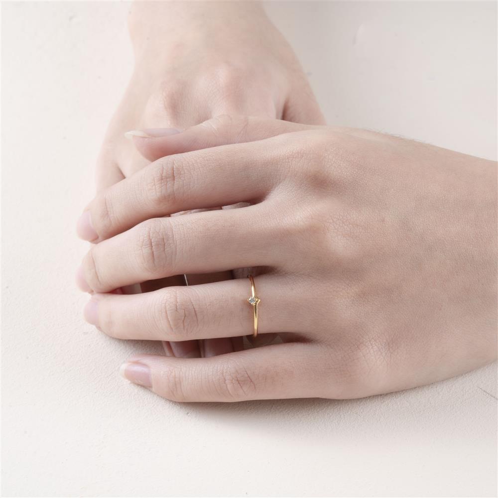 Thiết kế nhẫn nổi bật với đường chữ V mềm mại ôm trọn viên kim cương nhỏ ở trung tâm, như một dấu yêu tinh tế được đặt đúng nơi cần chạm. Đai nhẫn thanh mảnh, bo cong nhẹ giúp cảm giác đeo êm ái và tôn dáng tay một cách tự nhiên.