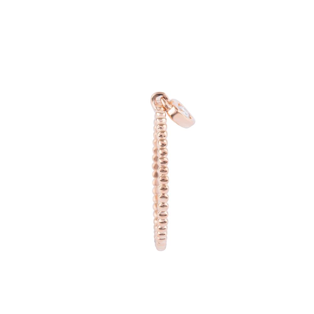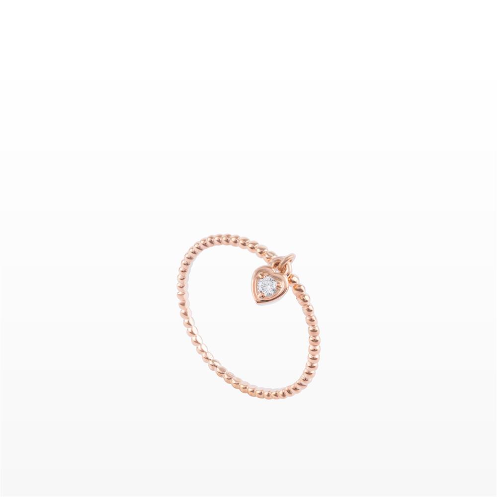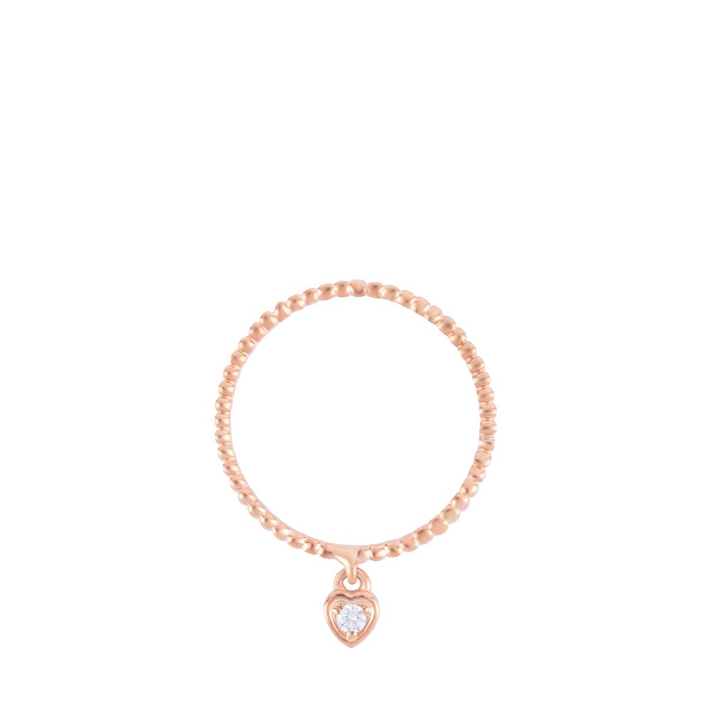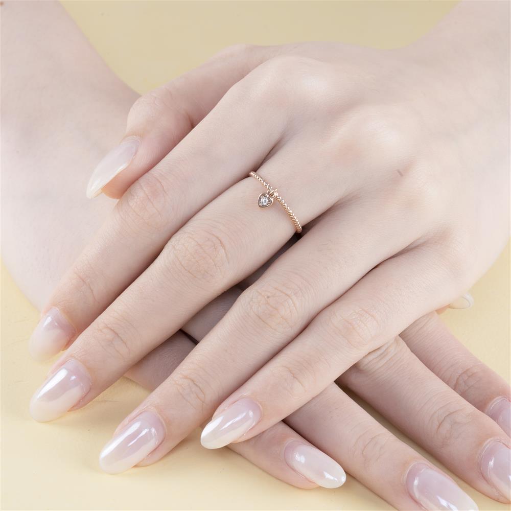 Chiếc nhẫn vàng hồng tinh tế với thiết kế thân hạt bi nhỏ nhắn, tạo nên vẻ mềm mại và hiện đại. Điểm nhấn là charm hình trái tim đồng điệu cùng sắc vàng hồng, ôm trọn viên kim cương lấp lánh – biểu tượng của tình yêu trọn vẹn và sự nữ tính sang trọng.