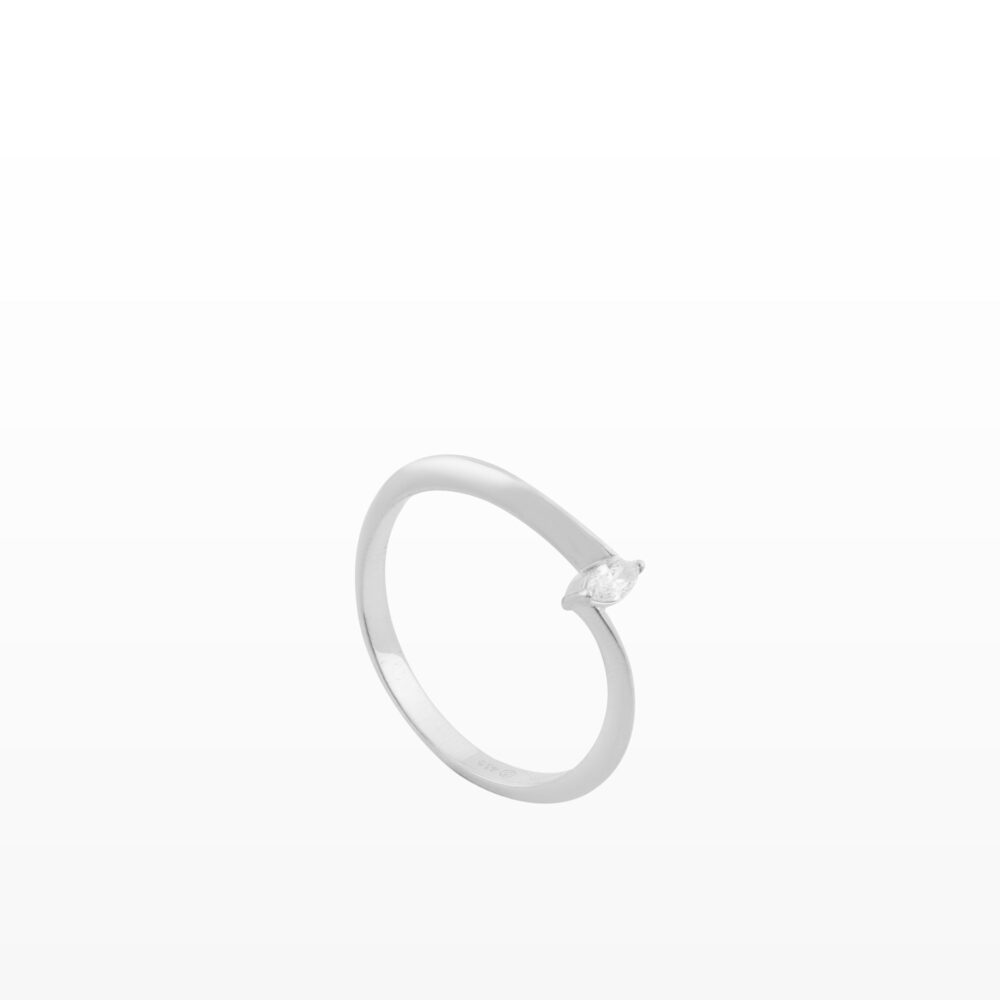 Thiết kế nhẫn mảnh thanh thoát, điểm xuyết viên kim cương dáng giọt nước như một nốt chấm tinh khôi của cảm xúc. Không phô trương, không cầu kỳ, chiếc nhẫn mang vẻ đẹp nhẹ nhàng – đủ để tôn lên bàn tay, đủ để giữ lại một lời yêu kín đáo.