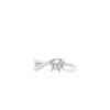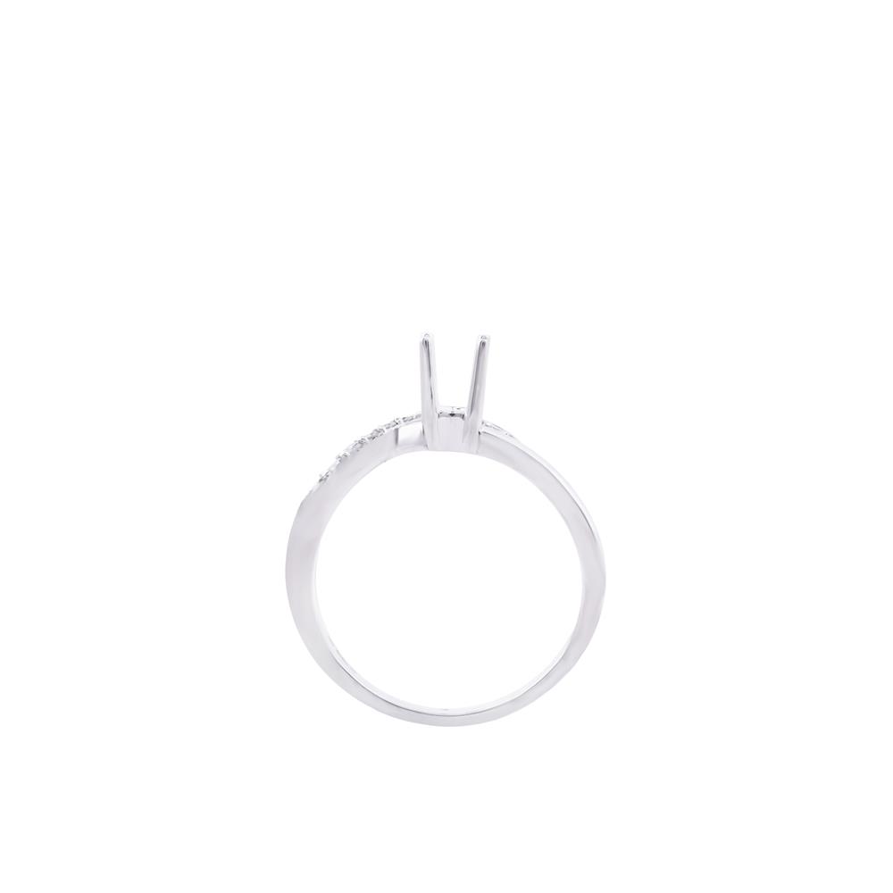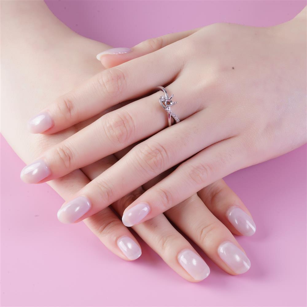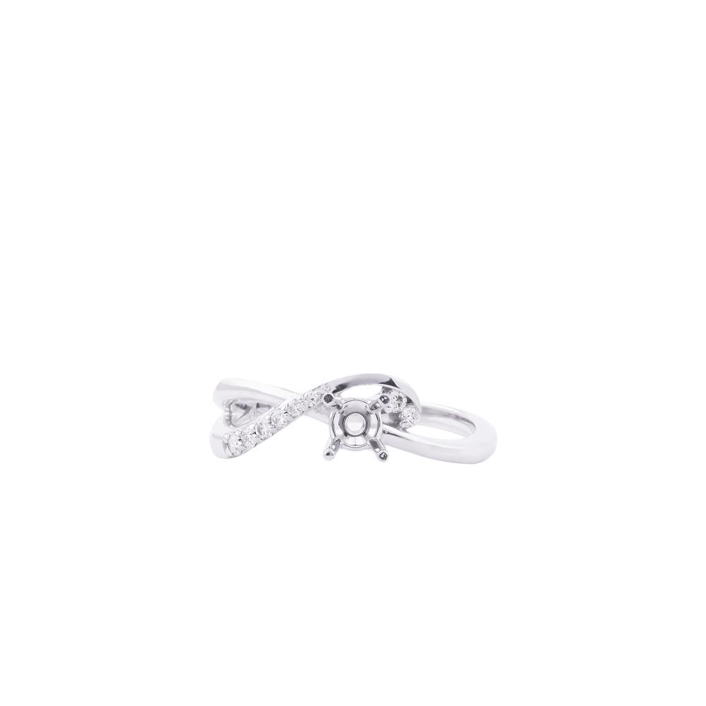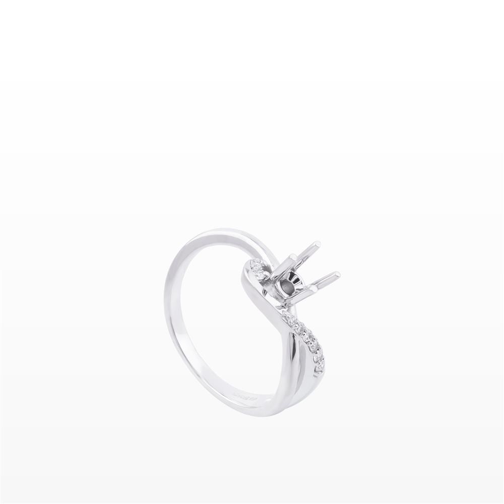 Nhẫn được thiết kế với dáng xoắn mềm mại, hai nhánh nhẫn đan nhẹ vào nhau và hội tụ tại vị trí ổ chủ trung tâm. Một nhánh được đính kim cương li ti lấp lánh, nhánh còn lại trơn mịn, tạo sự tương phản tinh tế và cảm giác chuyển động uyển chuyển khi nhìn nghiêng.