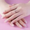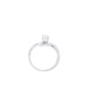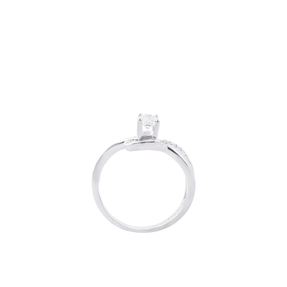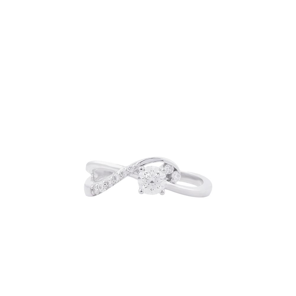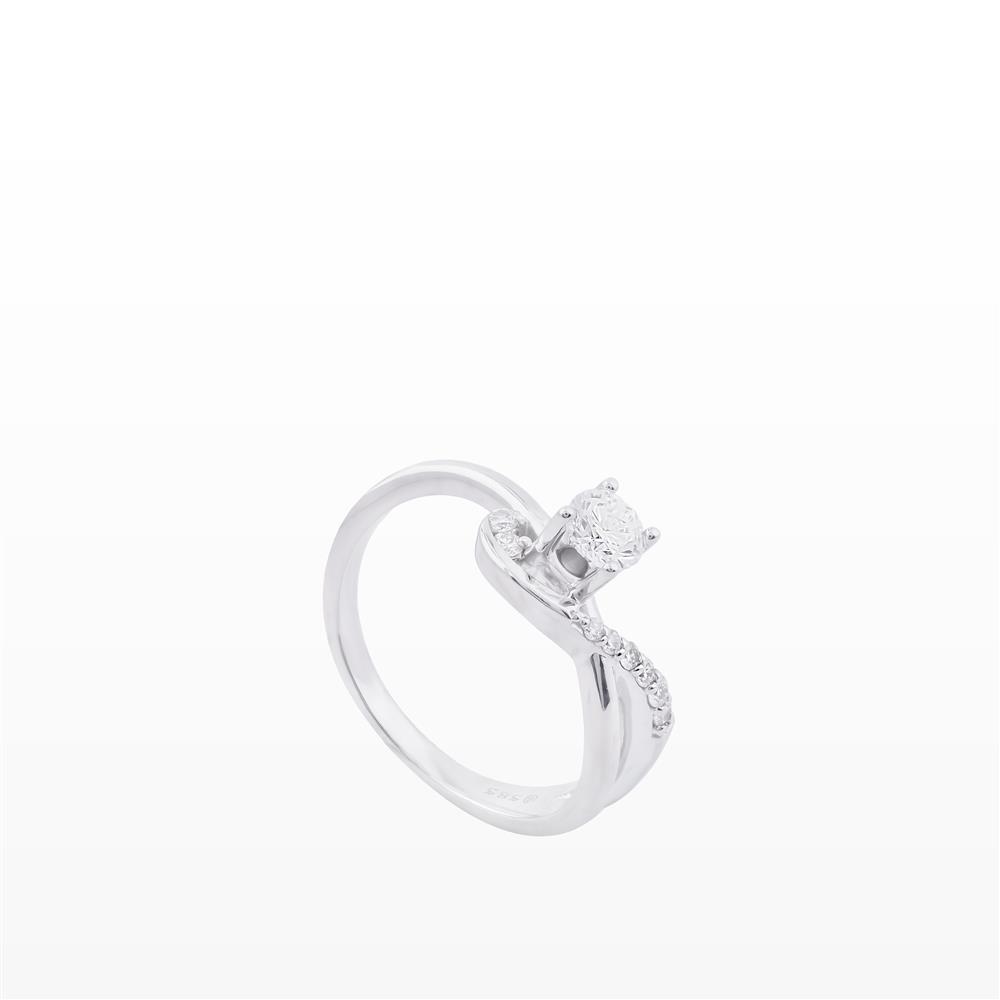 Nhẫn kim cương nổi bật với thiết kế dáng xoắn mềm mại, đan nhẹ vào nhau và hội tụ tại viên kim cương tròn ở trung tâm. Một nhánh nhẫn được đính kim cương li ti lấp lánh, nhánh còn lại trơn mịn, tạo sự tương phản tinh tế và cảm giác chuyển động uyển chuyển trên ngón tay.
