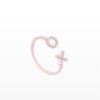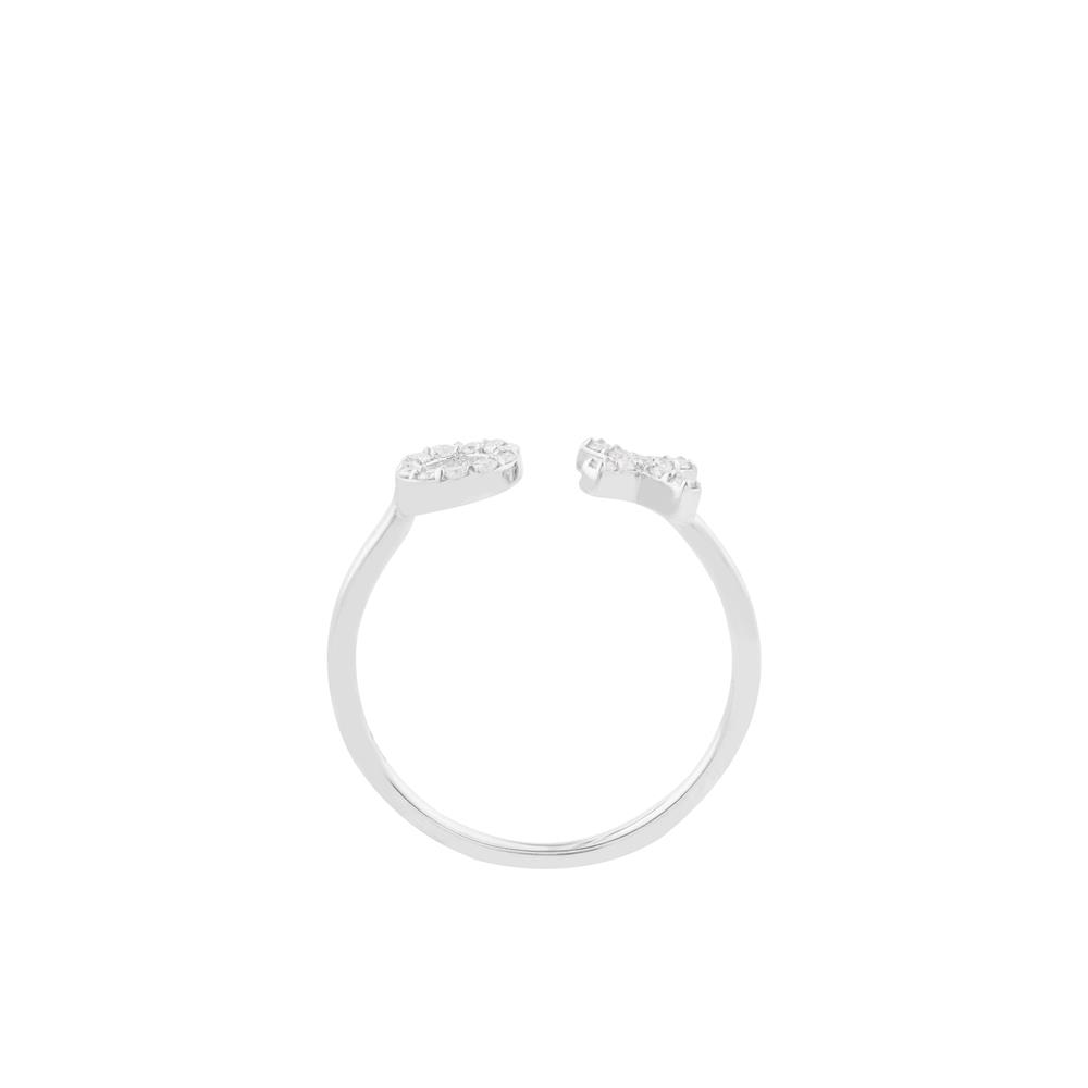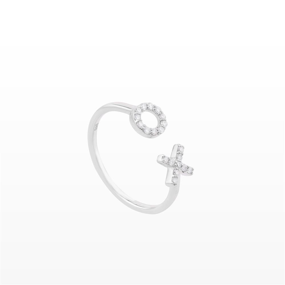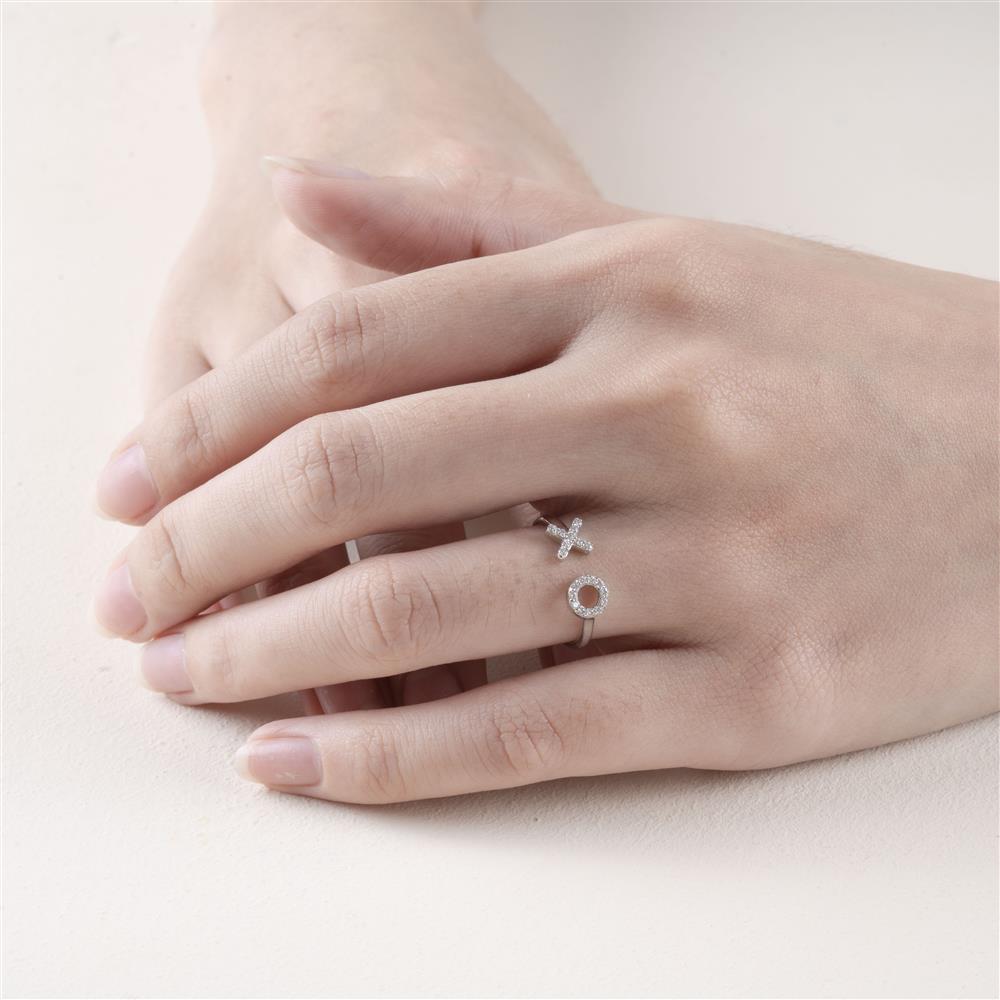 Thiết kế nhẫn dáng hở (open ring) gây ấn tượng với hai biểu tượng đối lập nhưng hài hòa: chữ O tròn đầy và chữ X sắc nét, cả hai đều được đính kim cương tinh xảo. Sự kết hợp tạo nên một tổng thể vừa hiện đại, phá cách vừa mang thông điệp thú vị về sự kết nối, lựa chọn và cân bằng cảm xúc.