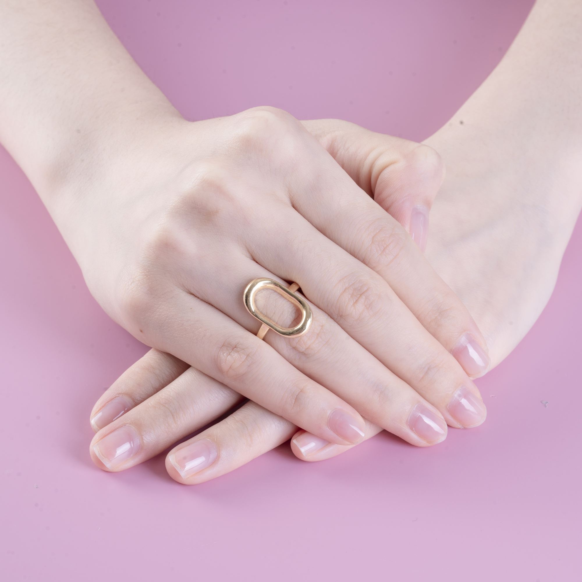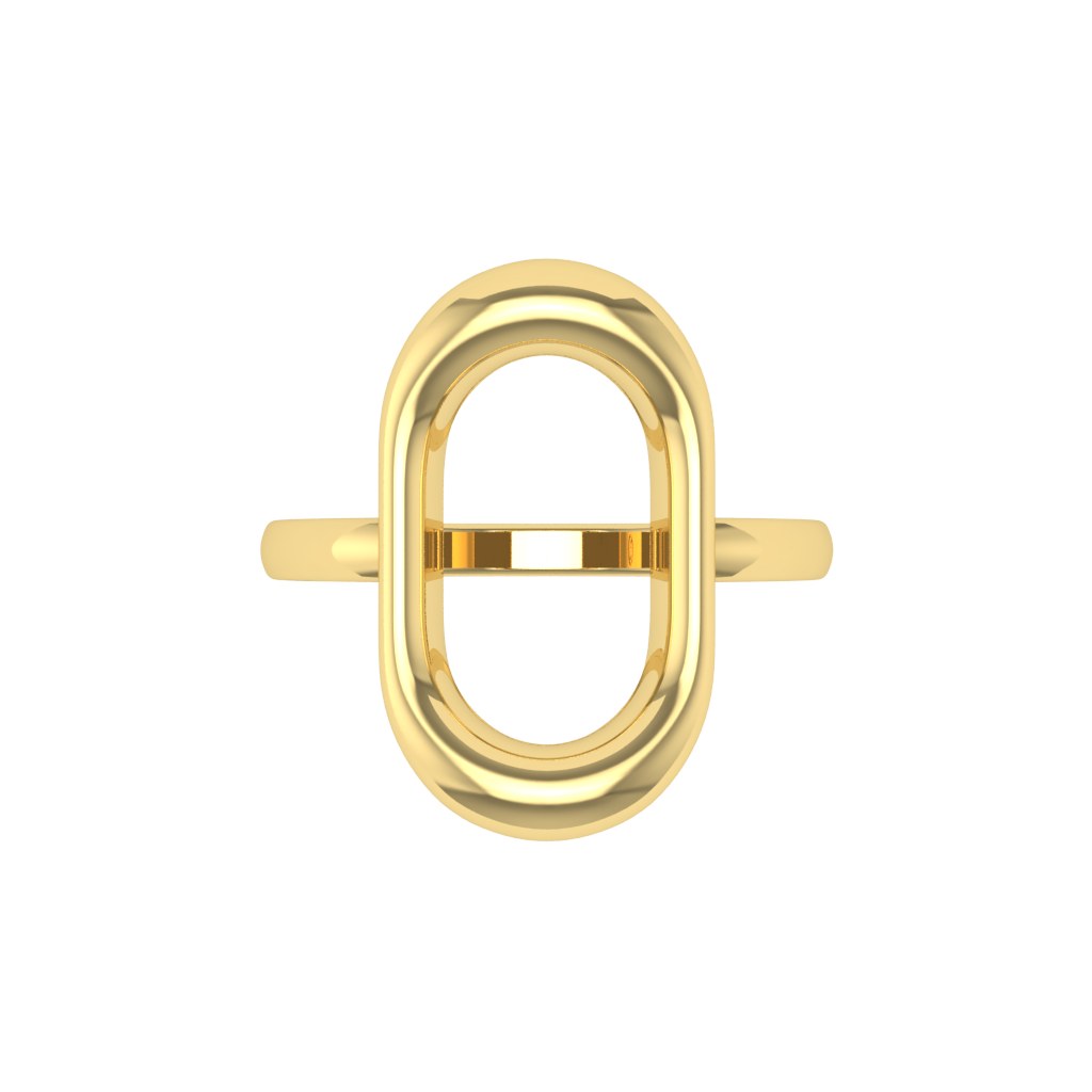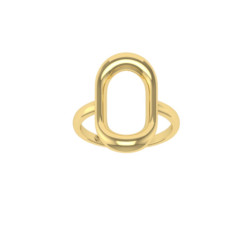 Chiếc nhẫn nổi bật với thiết kế hình oval bản lớn, mang tinh thần tối giản nhưng đầy tính tuyên ngôn. Đường nét bo tròn mềm mại kết hợp cùng bề mặt ánh kim sáng bóng tạo nên hiệu ứng thị giác hiện đại, thu hút ánh nhìn ngay từ lần đầu tiên.