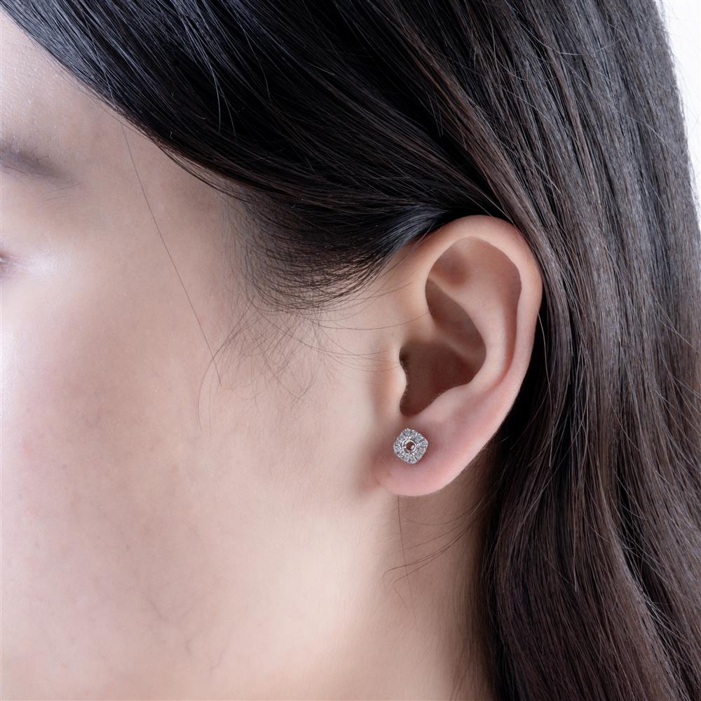Thiết kế vỏ bông tai được bao quanh bởi vòng kim cương tấm kiểu halo tạo hình vuông bo góc (cushion halo), mang đến hiệu ứng ánh sáng rực rỡ và cảm giác viên đá lớn hơn. Các viên kim cương được đính đều tay, tạo độ lấp lánh tinh xảo nhưng vẫn giữ tổng thể gọn gàng, thanh lịch.