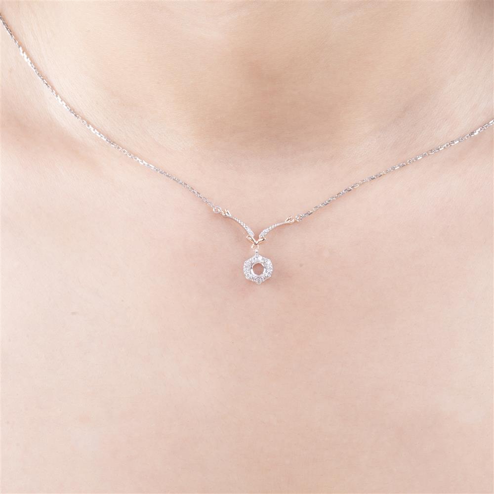 Phần mặt dây được chế tác dạng viền hoa 6 cánh tinh xảo, với khoảng trống ở trung tâm để nàng có thể tùy chọn gắn viên kim cương chủ theo sở thích. Đây chính là thiết kế giúp nàng tự tạo dấu ấn riêng — một viên đá nhỏ xinh thanh lịch, hay một viên lớn thật nổi bật đều phù hợp tuyệt vời.