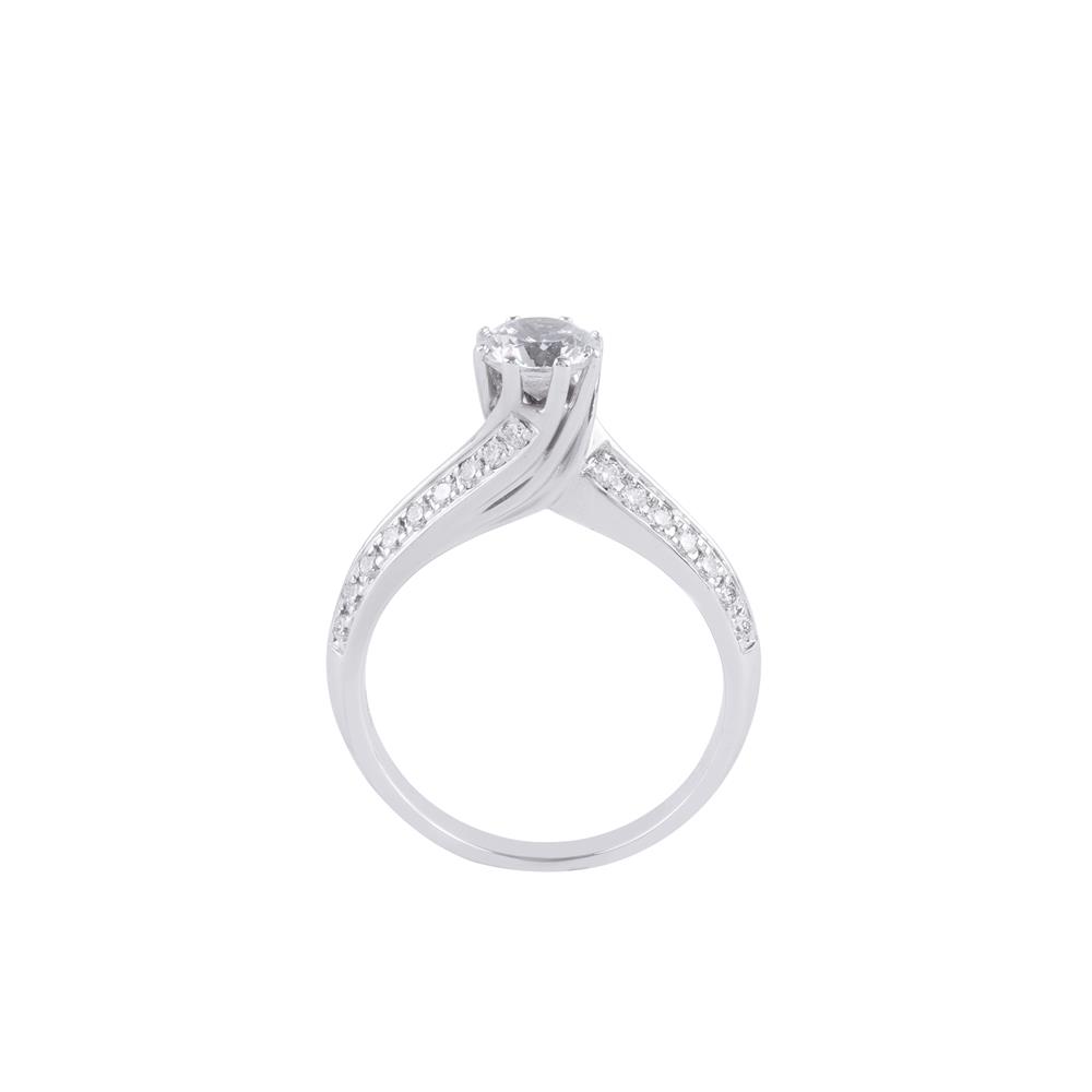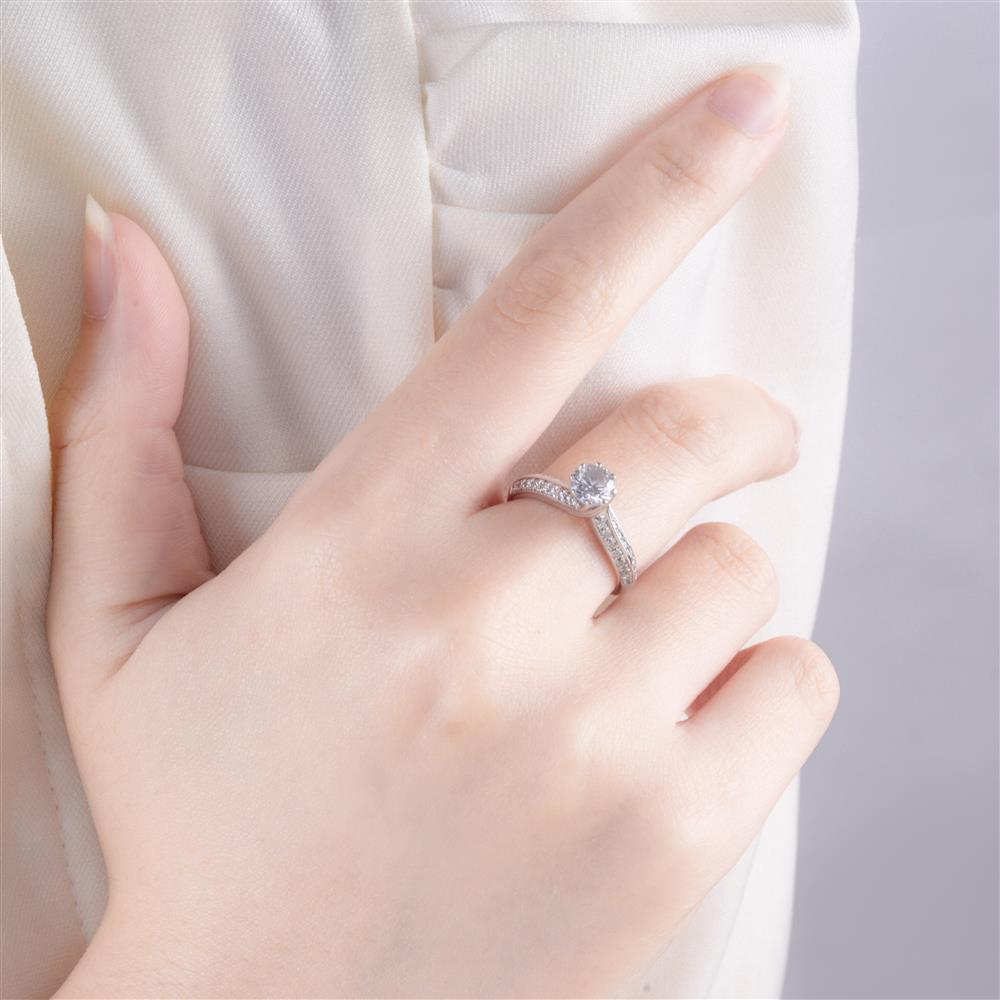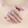 Chiếc nhẫn gây ấn tượng bởi thiết kế hai rãnh đính kim cương chạy dọc thân, như hai dòng thời gian cùng hướng về một viên chủ sáng bừng ở trung tâm. Sự tách nhẹ này không chỉ tạo cảm giác hiện đại, mà còn khiến viên kim cương chủ trở nên nổi bật tuyệt đối – như một khoảnh khắc đặc biệt trong đời được nâng niu đúng nơi, đúng thời điểm.