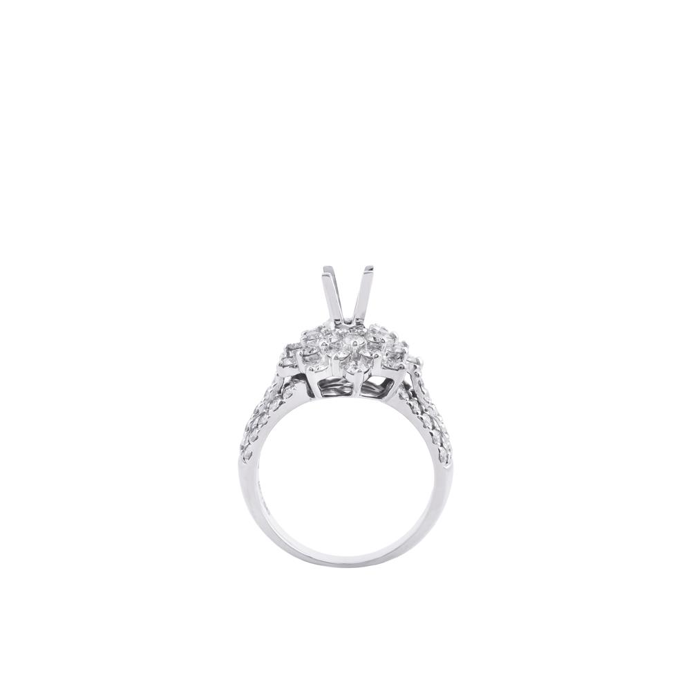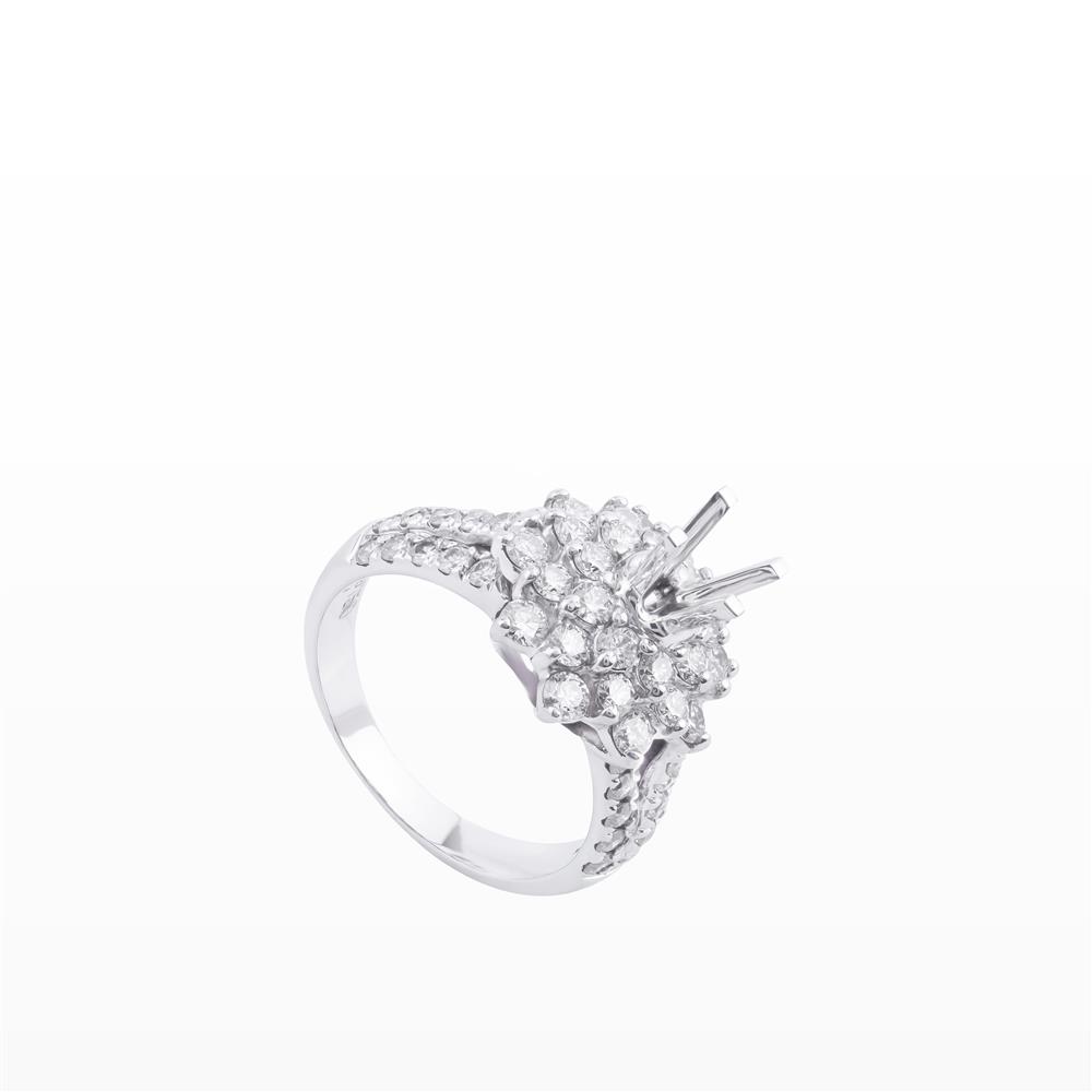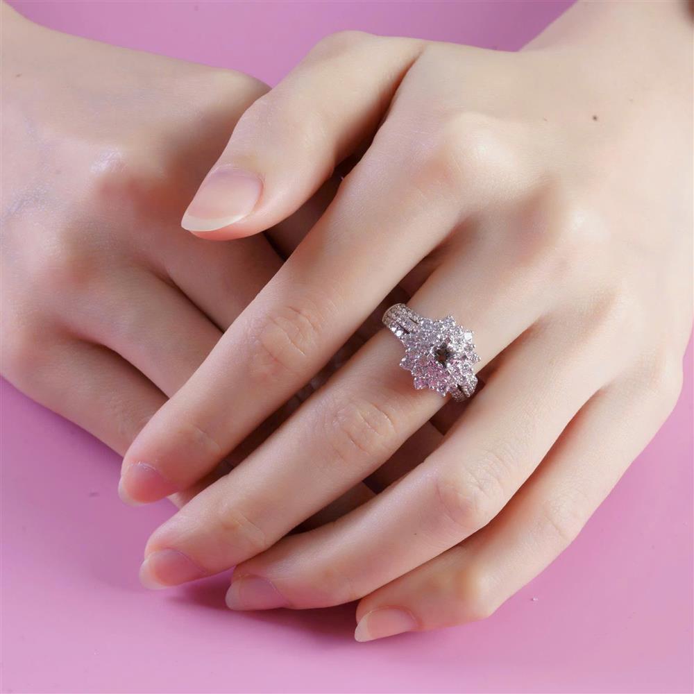 Nhẫn kim cương gây ấn tượng mạnh với thiết kế dáng hoa nhiều tầng, nơi các viên kim cương được sắp xếp dày dặn, tỏa đều quanh trung tâm, tạo hiệu ứng ánh sáng rực rỡ và nổi bật ngay từ ánh nhìn đầu tiên. Phần mặt nhẫn lớn, được hoàn thiện tinh xảo, mang lại cảm giác sang trọng và đẳng cấp.
