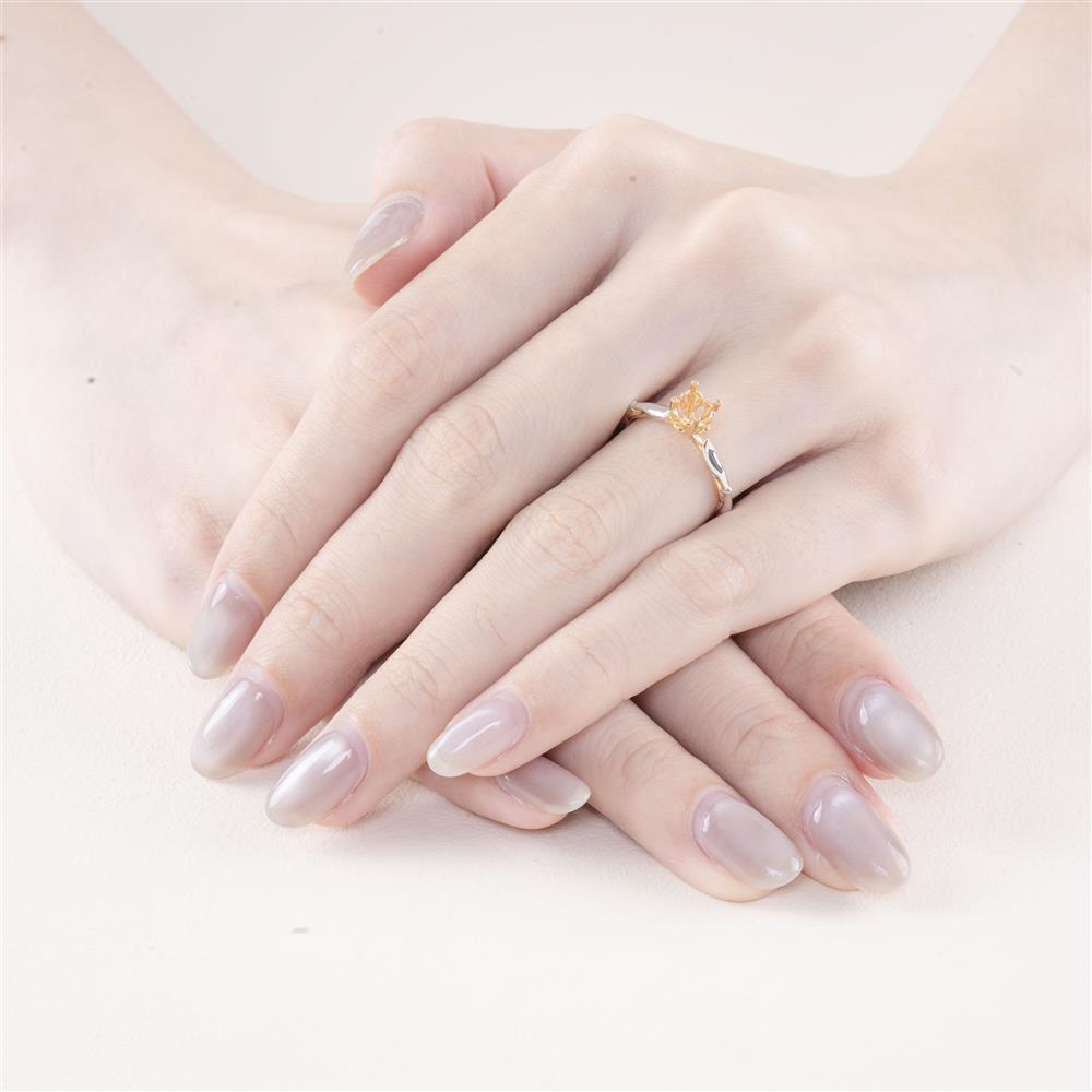 Mẫu nhẫn mang thiết kế đài hoa nở tinh xảo với sự kết hợp hài hòa giữa vàng trắng hiện đại và vàng vàng dịu nhẹ, tạo nên một tác phẩm trang sức đầy nghệ thuật. Đài nhẫn được chạm khắc tinh tế như cánh hoa đang hé mở, sẵn sàng đón lấy viên đá chủ – biểu tượng của sự tỏa sáng và kiêu hãnh.