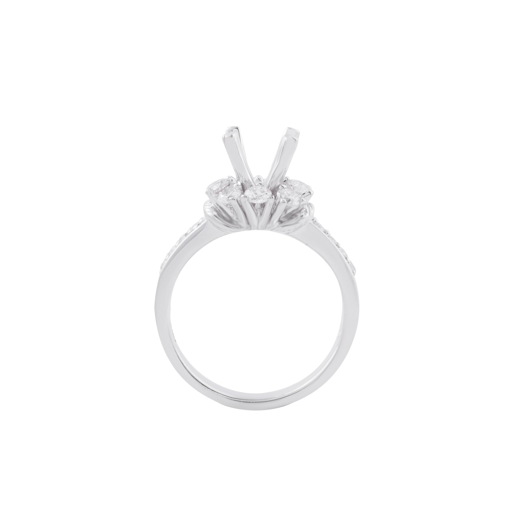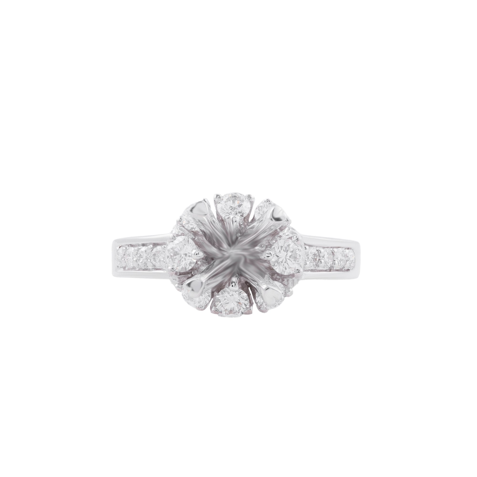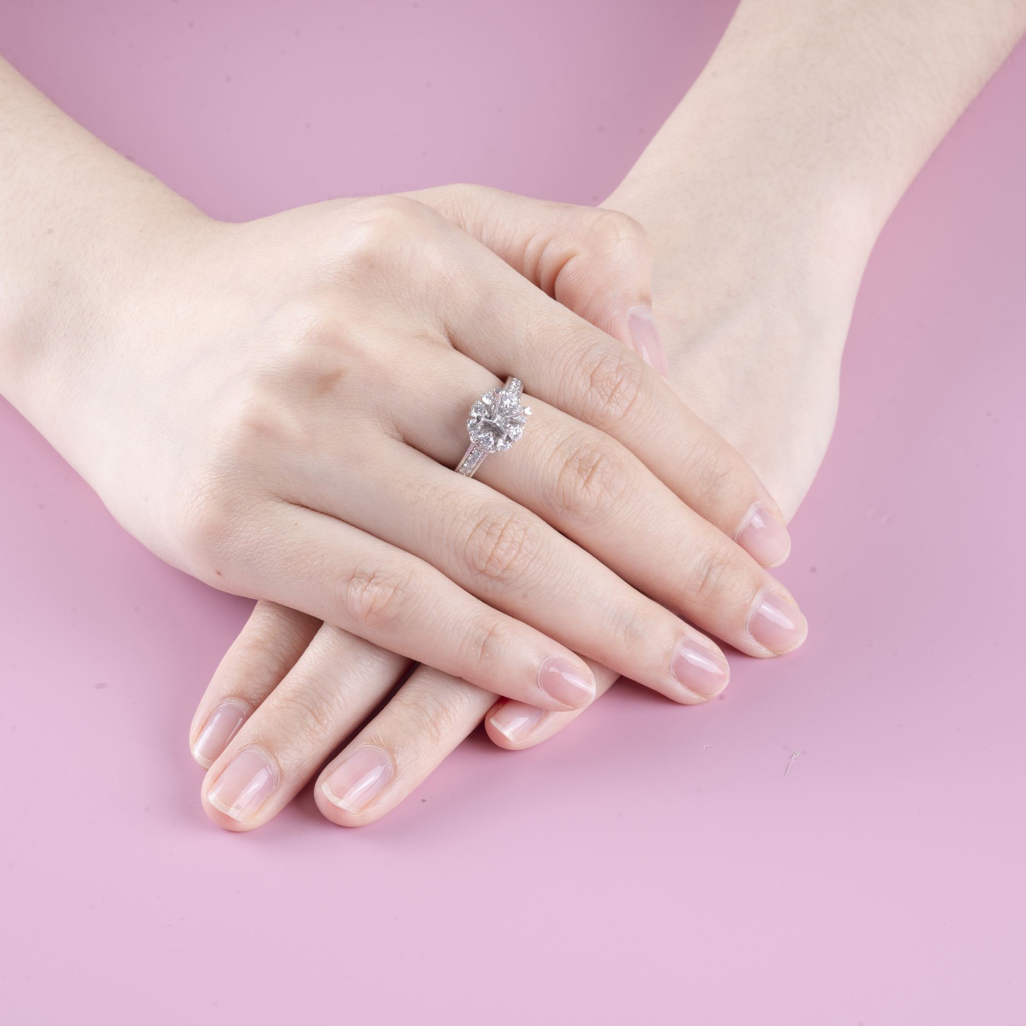 Chiếc nhẫn kim cương dáng halo cách điệu mang vẻ đẹp sang trọng và đầy cuốn hút. Thiết kế nổi bật với cụm kim cương trung tâm được nâng cao, bao quanh bởi các viên kim cương nhỏ tạo hiệu ứng lấp lánh đa chiều.