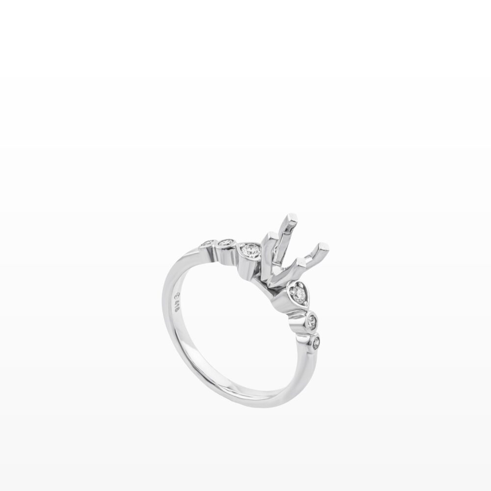 Chiếc nhẫn được thiết kế với tinh thần hiện đại, tập trung tôn vinh vẻ đẹp của viên đá chủ qua bộ chấu cao thanh thoát. Phần thân nhẫn được điểm xuyết bởi các viên kim cương tấm sắp xếp tinh tế, tạo hiệu ứng lấp lánh liên tục khi chuyển động, đồng thời dẫn ánh nhìn về trung tâm một cách đầy cuốn hút.
