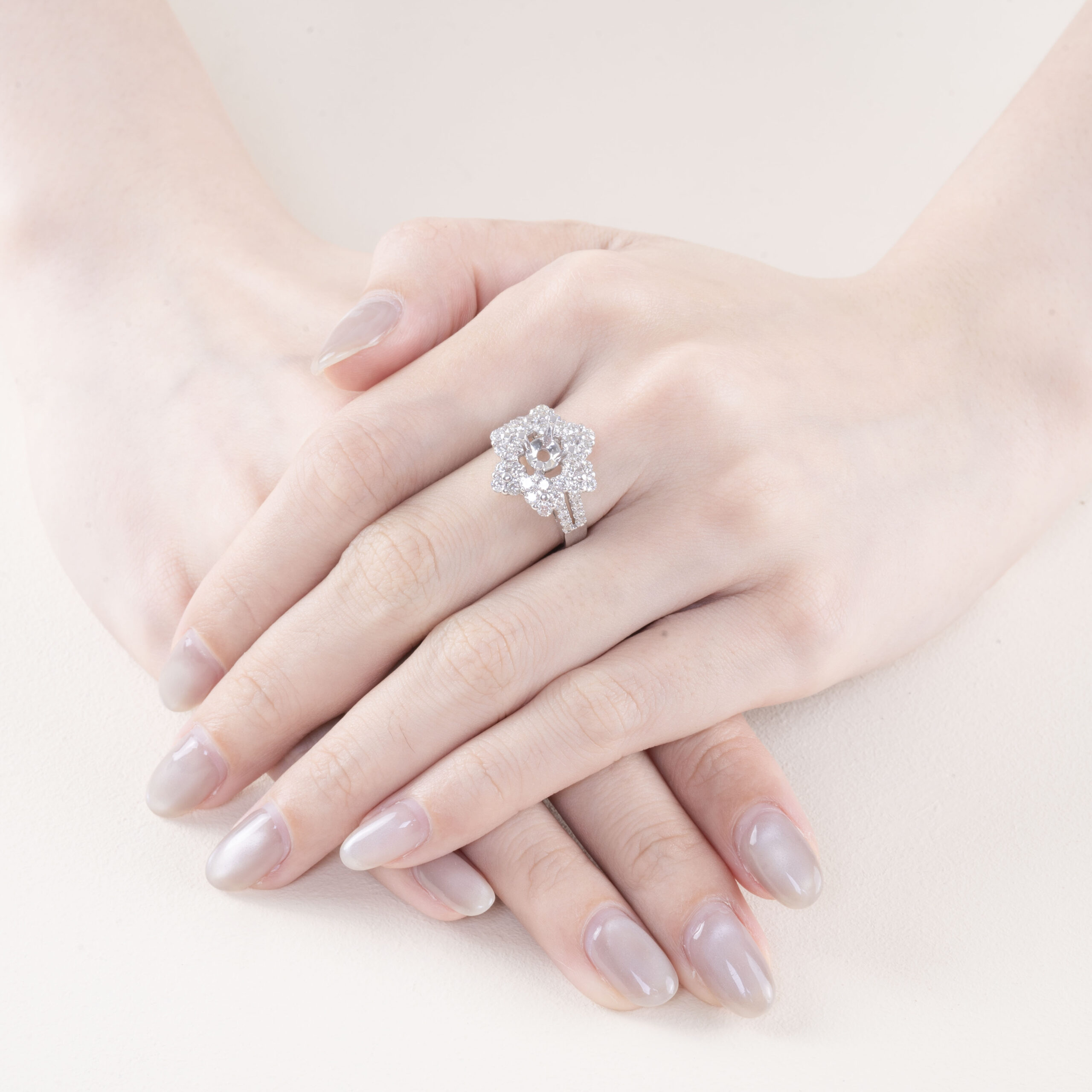 Được chế tác tinh xảo với những viên kim cương tỏa tròn đều quanh tâm nhẫn – mỗi viên đá như một cánh hoa phản chiếu ánh sáng tinh khôi bừng nở như đóa hoa tinh tú trên tay, tượng trưng cho sự tự tin, yêu kiều và vẻ đẹp thuần khiết của người phụ nữ hiện đại.