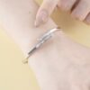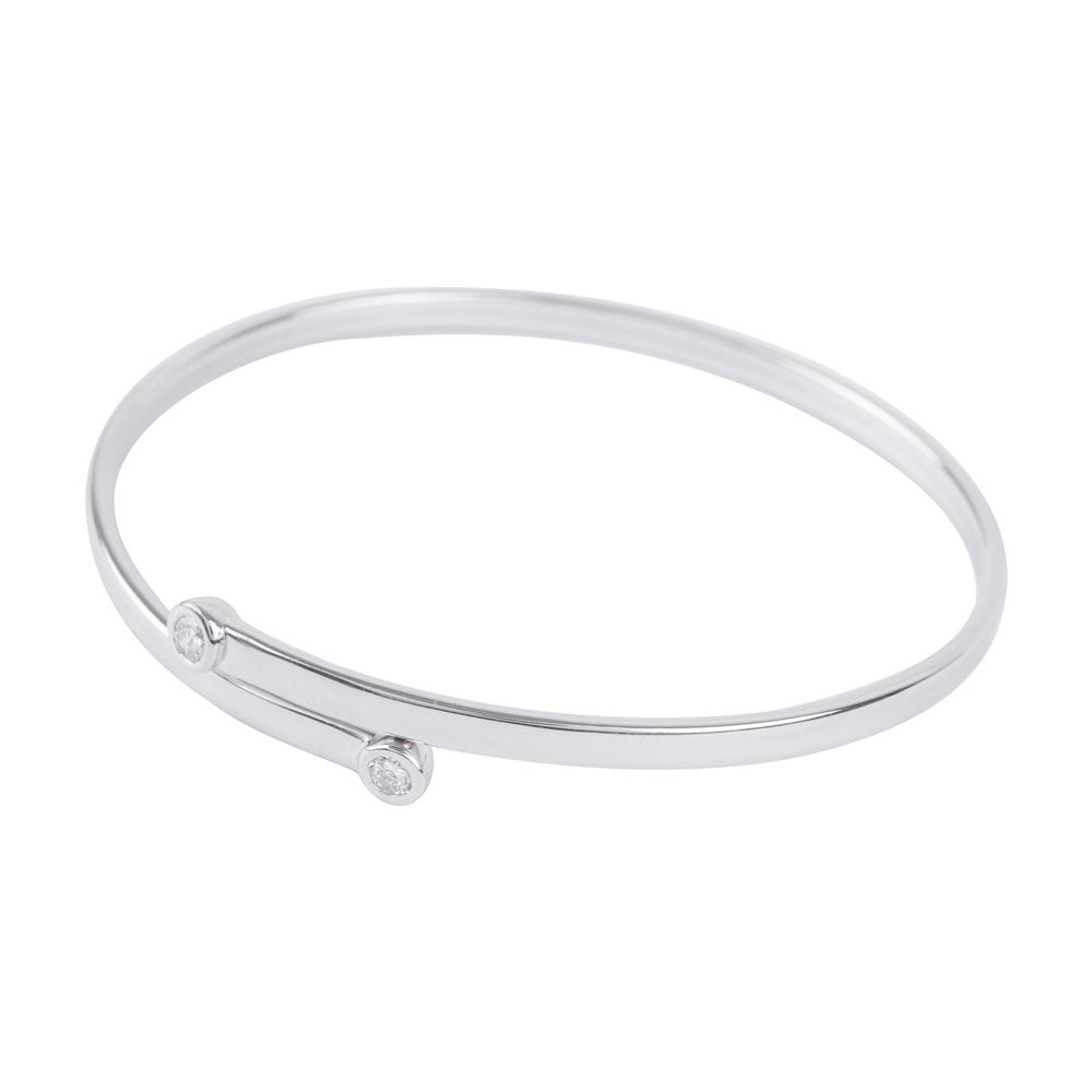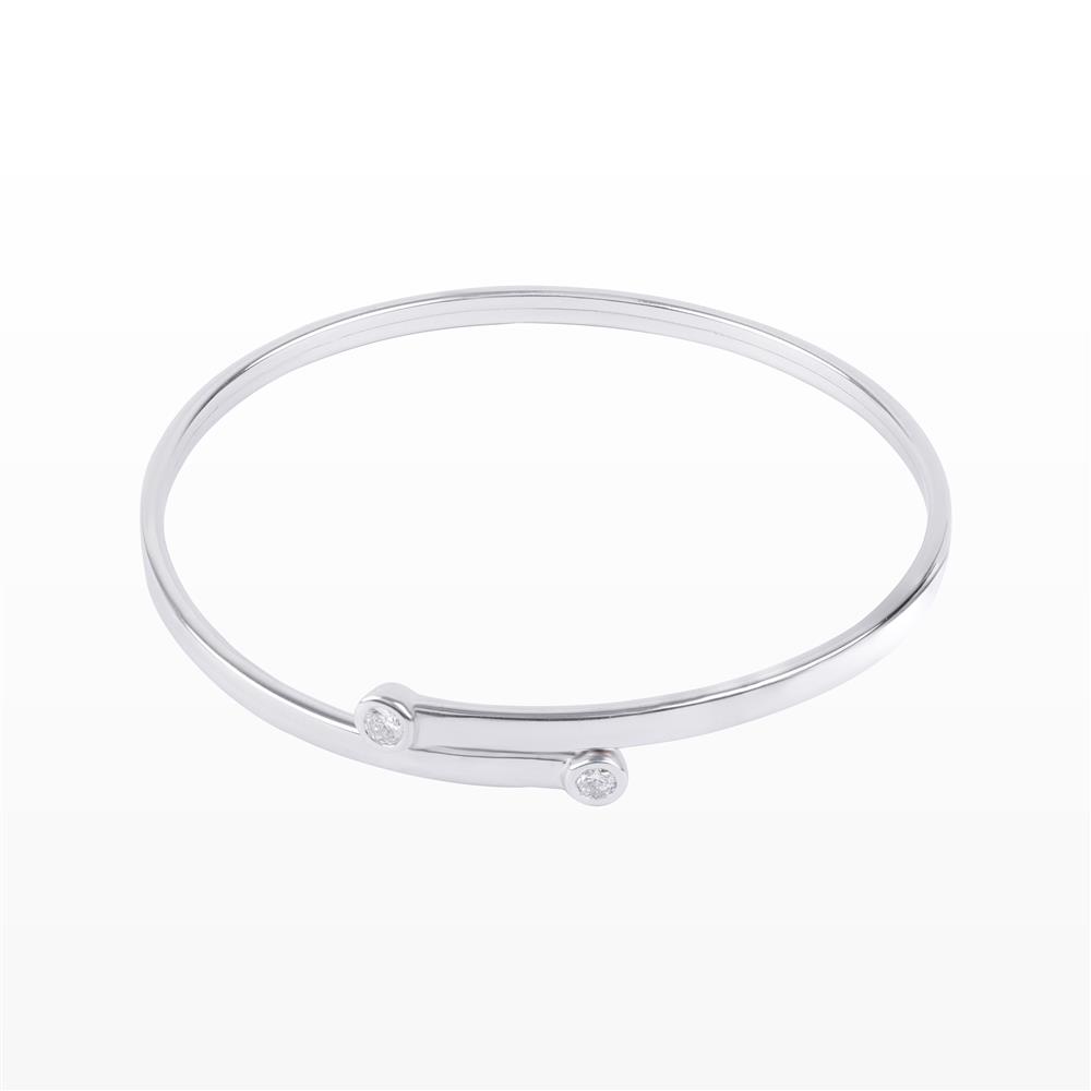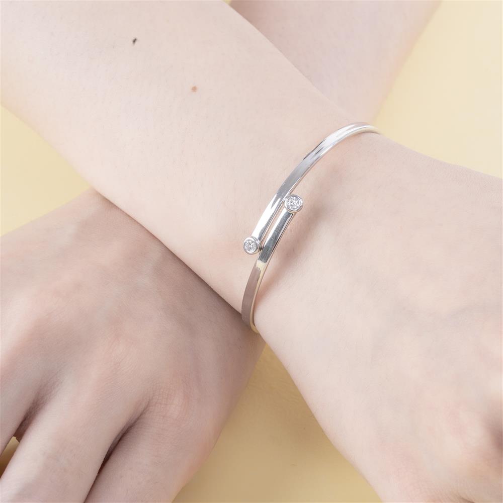 Vòng tay vàng trắng thiết kế tối giản tinh tế, điểm xuyết hai viên kim cương nhỏ đối xứng ở hai đầu, tạo điểm nhấn thanh lịch và hiện đại. Kiểu dáng thanh mảnh nhưng sang trọng, dễ dàng kết hợp với nhiều trang phục, tôn vinh nét đẹp tinh giản mà đẳng cấp.