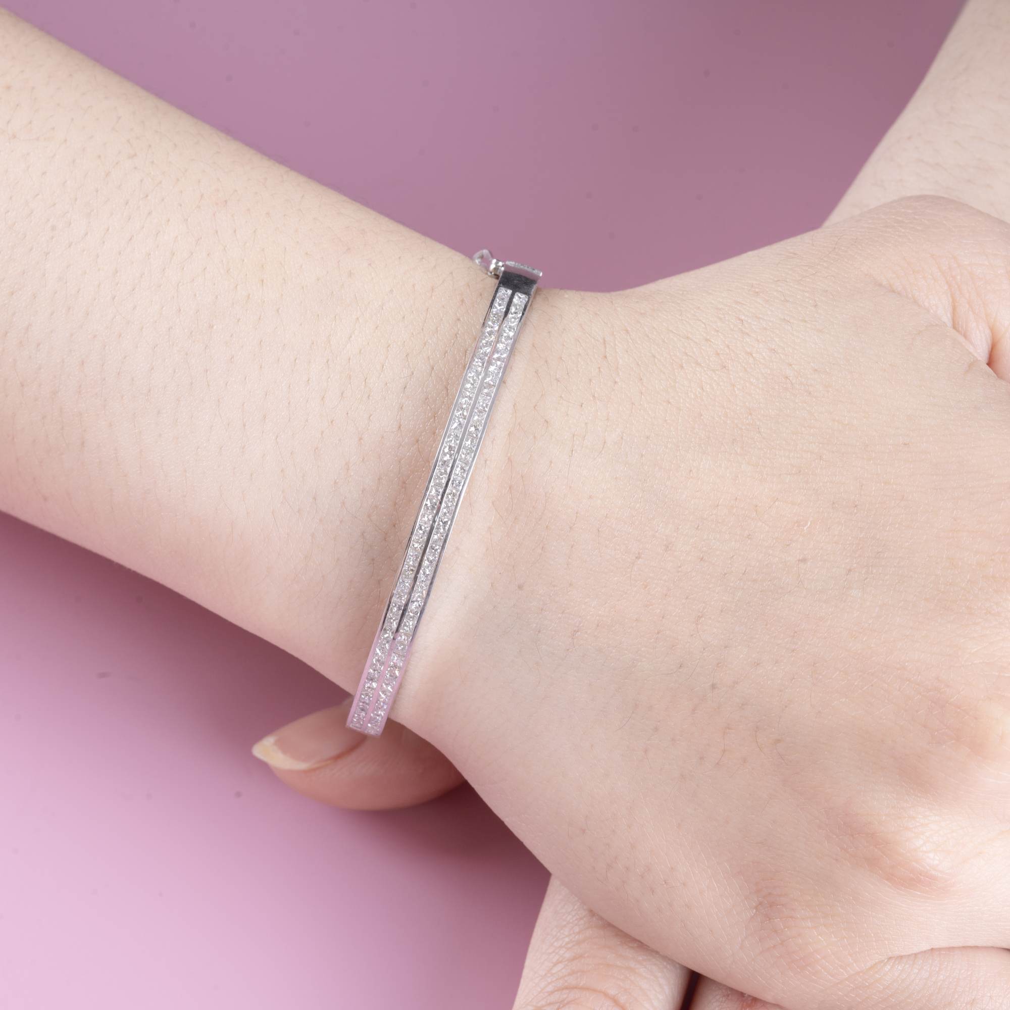 Vòng tay gây ấn tượng với thiết kế hai đường song song tinh tế, tựa như hai dải ánh sáng đồng hành, được đính kim cương tấm đều đặn tạo nên hiệu ứng lấp lánh đầy cuốn hút. Sự sắp xếp cân đối mang lại cảm giác thanh lịch nhưng vẫn nổi bật, tôn lên vẻ đẹp hiện đại và chỉn chu.