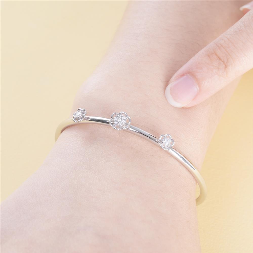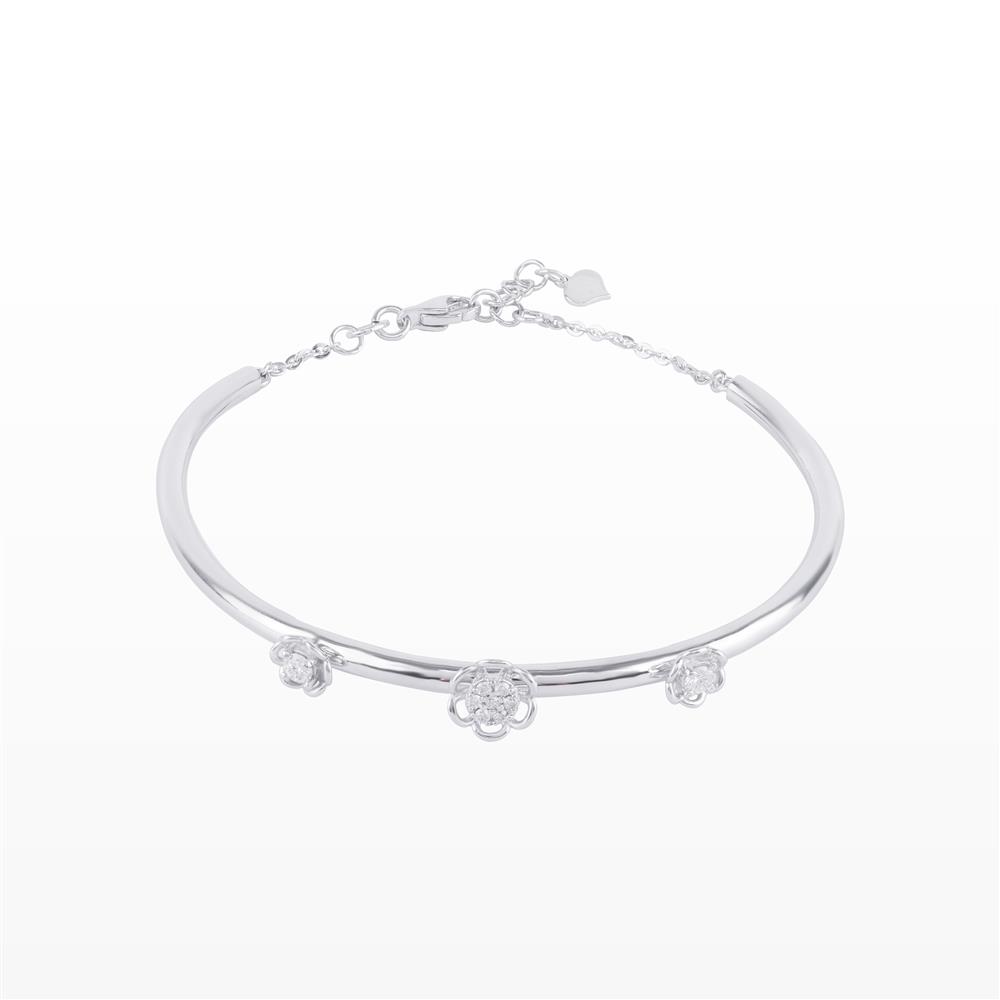Ba bông hoa nhỏ được chế tác tỉ mỉ, nở rộ trên nền vàng trắng sáng mịn, mỗi cánh hoa đều tỏa ra ánh sáng riêng – nhẹ nhàng nhưng đầy cuốn hút.