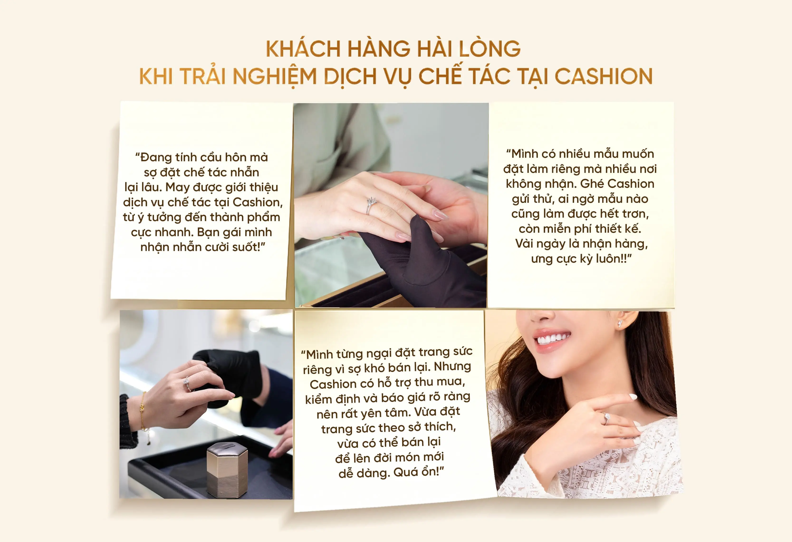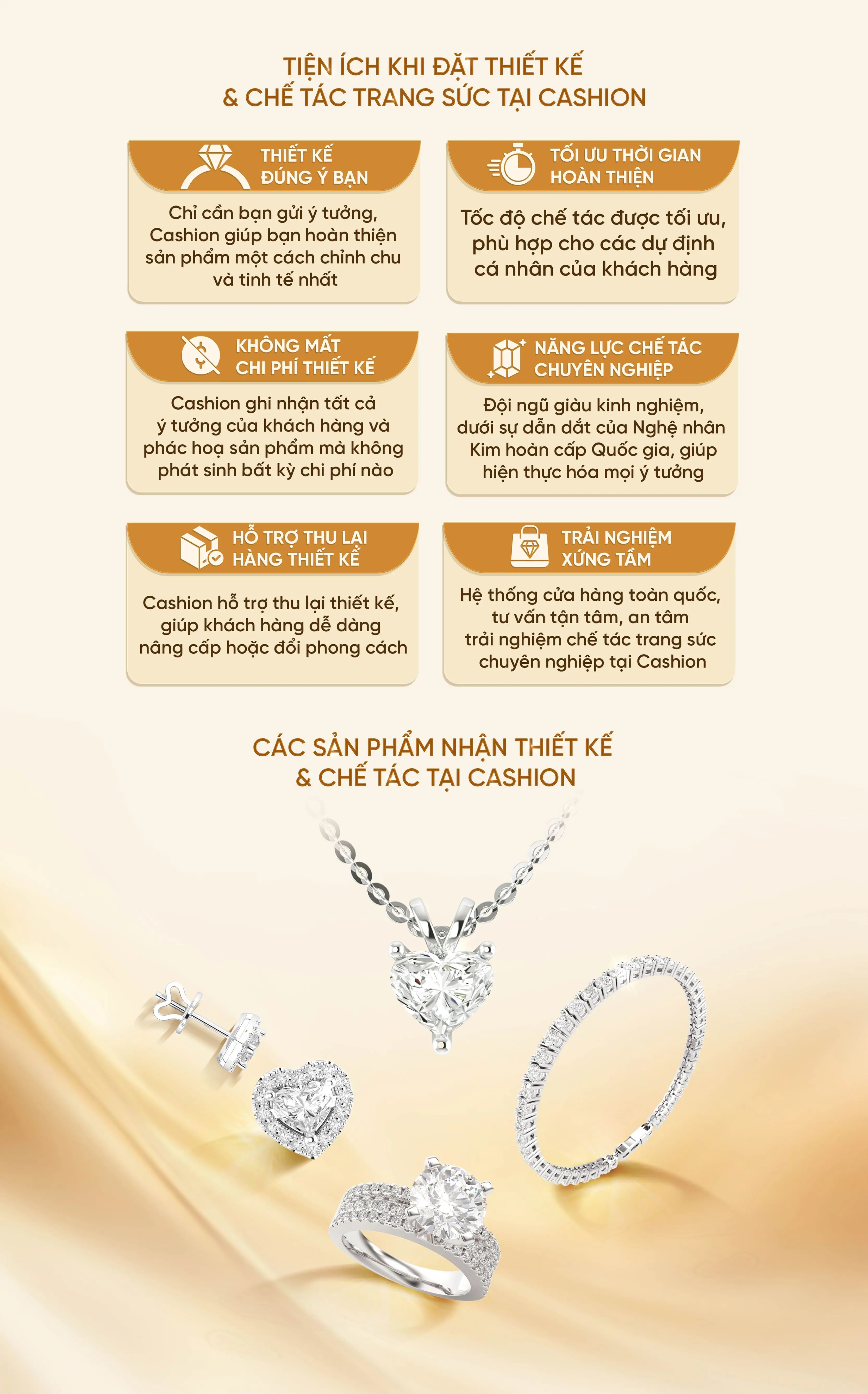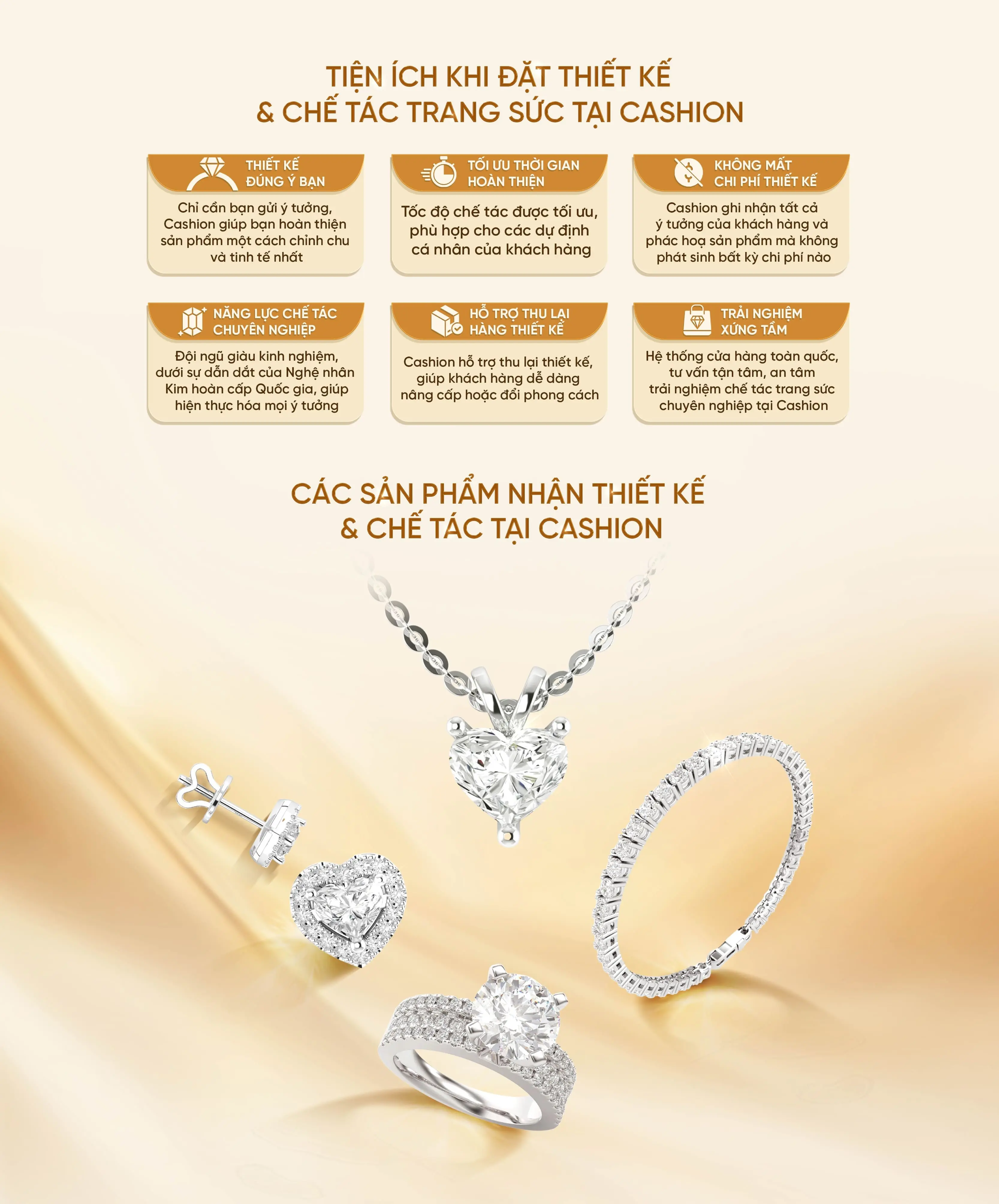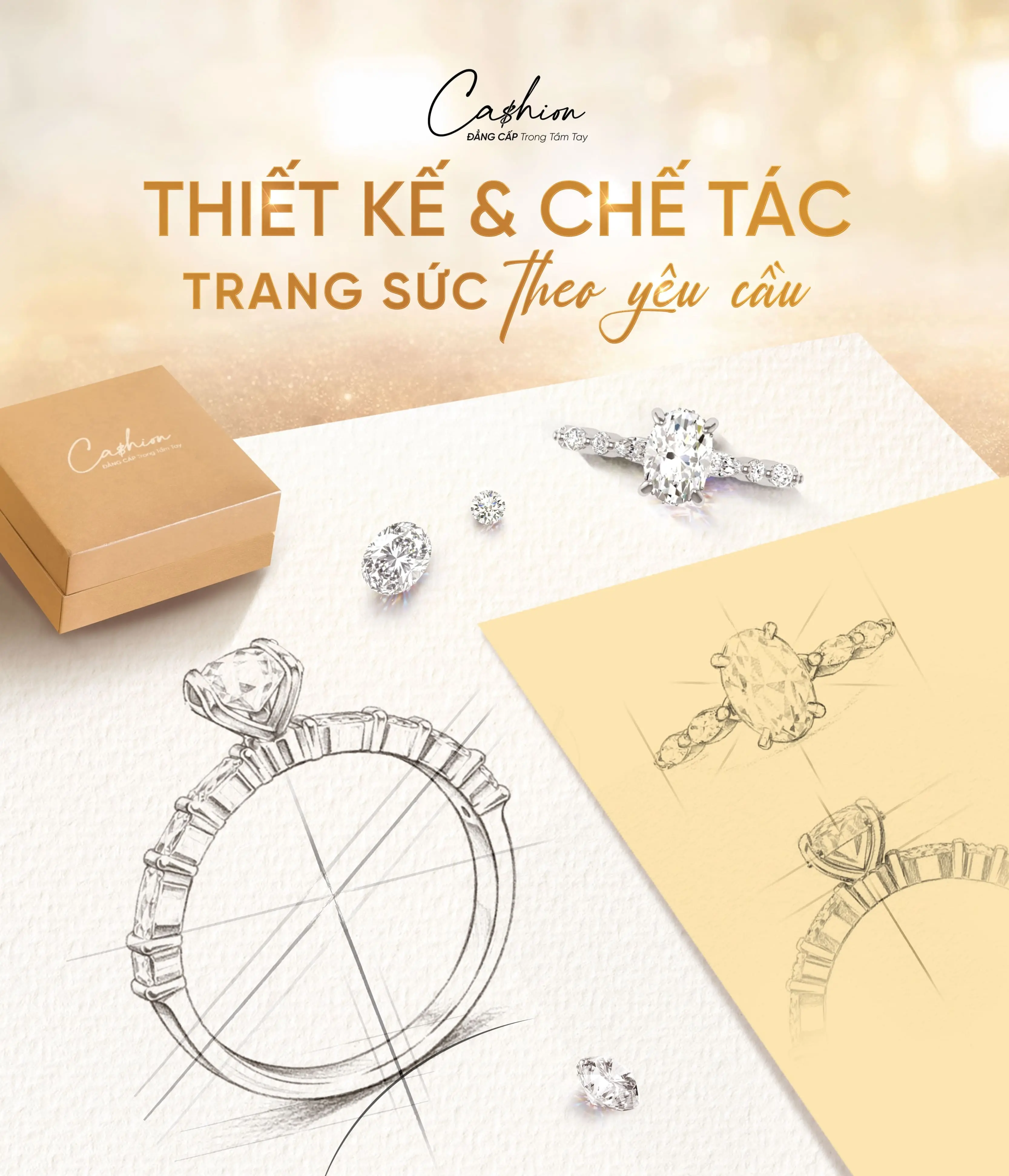 Quý khách hoàn toàn có thể tự đưa ra ý tưởng thiết kế cho trang sức của mình. Cashion sẽ làm việc cùng quý khách để biến ý tưởng đó thành hiện thực, đảm bảo sản phẩm cuối cùng không chỉ đẹp mà còn mang đậm dấu ấn cá nhân của bạn. Nếu cần hỗ trợ, đội ngũ thiết kế của Cashion luôn sẵn sàng tư vấn và tinh chỉnh ý tưởng để đạt được kết quả hoàn hảo nhất.