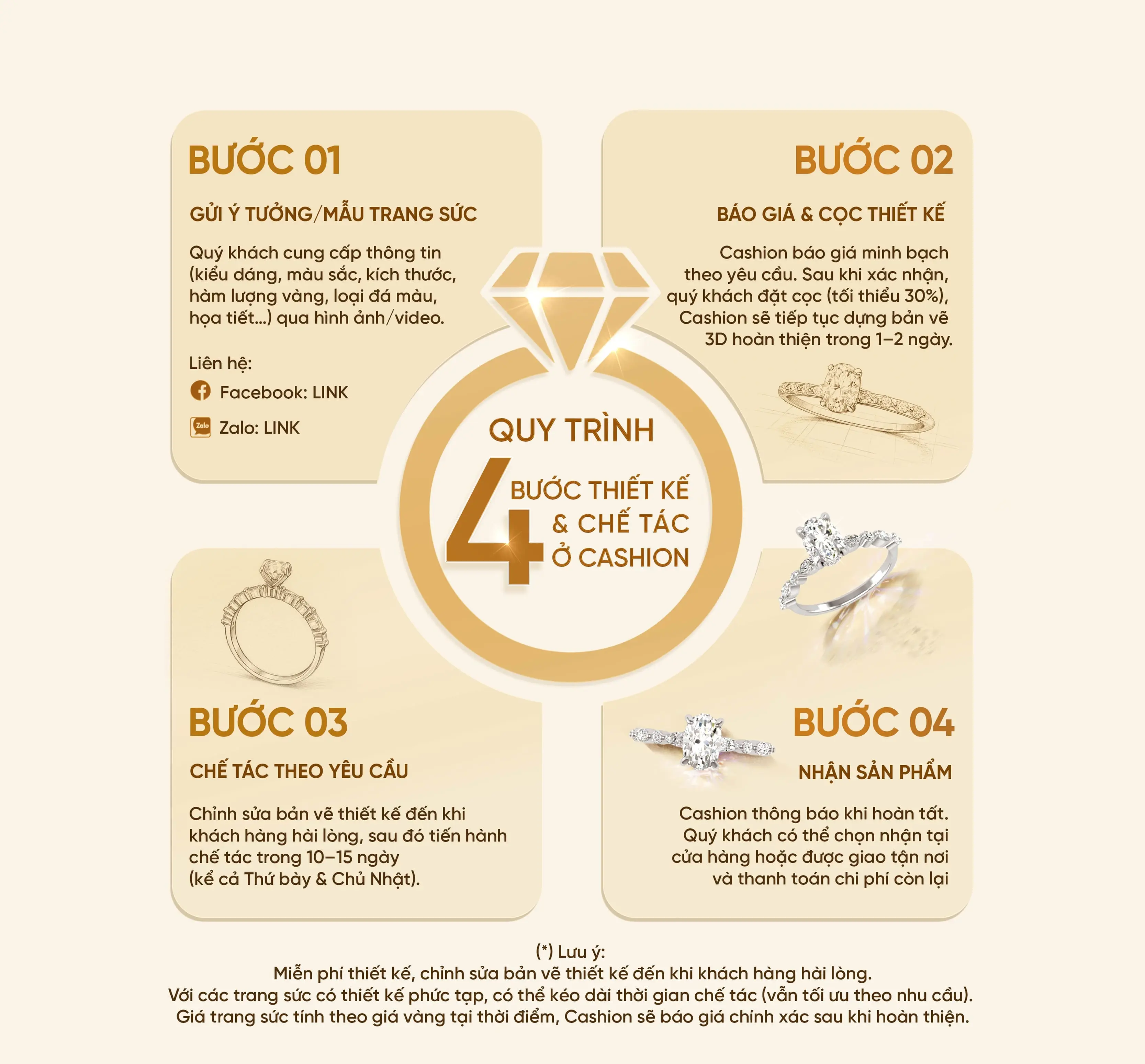 Trước khi bắt đầu chế tác, nhằm đảm bảo sản phẩm đúng ý muốn và giữ đúng tiến độ, Cashion sẽ làm việc chặt chẽ với quý khách trong từng lần chỉnh sửa để hoàn thiện thiết kế theo mong đợi.