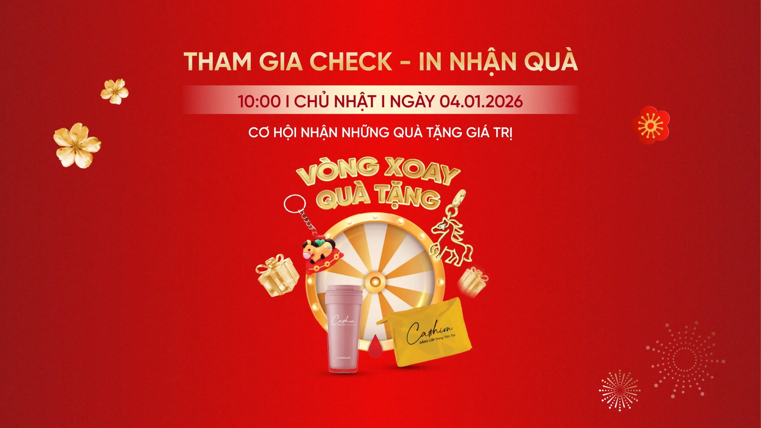 Từ 10H00 – 12H00 và 17H00 – 19H00 ngày 04.01.2026, hoạt động Vòng Xoay Quà Tặng Đón Năm Mới hoàn toàn MIỄN PHÍ sẽ diễn ra tại quầy Cashion.